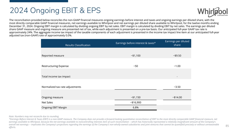 2024 Ongoing EBIT & EPS The reconciliation provided below reconciles the non-GAAP financial measures ongoing earnings before interest and taxes and ongoing earnings per diluted share, with the most directly comparable GAAP financial measures, net earnings available to Whirlpool and net earnings per diluted share available to Whirlpool, for the twelve months ending December 31, 2024. Ongoing EBIT margin is calculated by dividing ongoing EBIT by net sales. EBIT margin is calculated by dividing EBIT by net sales. The earnings per diluted share GAAP measure and ongoing measure are presented net of tax, while each adjustment is presented on a pre-tax basis. Our anticipated full-year GAAP tax rate is approximately 24%. The aggregate income tax impact of the taxable components of each adjustment is presented in the income tax impact line item at our anticipated full-year adjusted tax (non-GAAP) rate of approximately 0.0%. Earnings per diluted Earnings before interest & taxes* share Results Classification Reported measure ~$1,100 ~$9.50 Restructuring Expense ~50 ~1.00 Total income tax impact - Normalized tax rate adjustments ~3.50 Ongoing measure ~$1,150 ~$14.00 Net Sales ~$16,900 Ongoing EBIT Margin 6.8% Note: Numbers may not reconcile due to rounding *Earnings Before Interest & Taxes (EBIT) is a non-GAAP measure. The Company does not provide a forward-looking quantitative reconciliation of EBIT to the most directly comparable GAAP financial measure, net earnings available to Whirlpool, because the net earnings available to noncontrolling interests item of such reconciliation -- which has historically represented a relatively insignificant amount of the Company's overall net earnings -- implicates the Company's projections regarding the earnings of the Company's non wholly-owned subsidiaries and joint ventures that cannot be quantified precisely or without unreasonable 85 efforts.