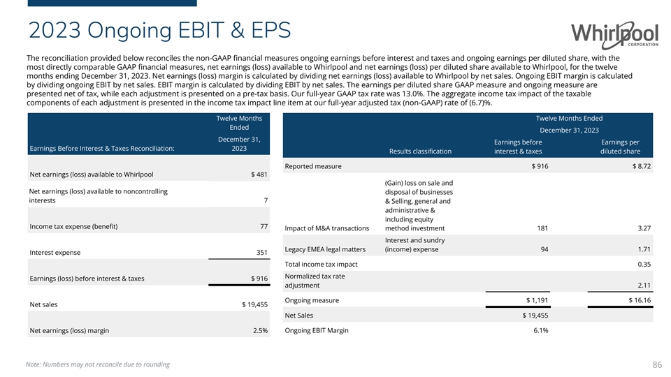 2023 Ongoing EBIT & EPS The reconciliation provided below reconciles the non-GAAP financial measures ongoing earnings before interest and taxes and ongoing earnings per diluted share, with the most directly comparable GAAP financial measures, net earnings (loss) available to Whirlpool and net earnings (loss) per diluted share available to Whirlpool, for the twelve months ending December 31, 2023. Net earnings (loss) margin is calculated by dividing net earnings (loss) available to Whirlpool by net sales. Ongoing EBIT margin is calculated by dividing ongoing EBIT by net sales. EBIT margin is calculated by dividing EBIT by net sales. The earnings per diluted share GAAP measure and ongoing measure are presented net of tax, while each adjustment is presented on a pre-tax basis. Our full-year GAAP tax rate was 13.0%. The aggregate income tax impact of the taxable components of each adjustment is presented in the income tax impact line item at our full-year adjusted tax (non-GAAP) rate of (6.7)%. Twelve Months Twelve Months Ended Ended December 31, 2023 December 31, Earnings before Earnings per Earnings Before Interest & Taxes Reconciliation: 2023 Results classification interest & taxes diluted share Reported measure $ 916 $ 8.72 Net earnings (loss) available to Whirlpool $ 481 (Gain) loss on sale and Net earnings (loss) available to noncontrolling disposal of businesses interests 7 & Selling, general and administrative & including equity Income tax expense (benefit) 77 Impact of M&A transactions method investment 181 3.27 Interest and sundry Legacy EMEA legal matters (income) expense 94 1.71 Interest expense 351 Total income tax impact 0.35 Normalized tax rate Earnings (loss) before interest & taxes $ 916 adjustment 2.11 Ongoing measure $ 1,191 $ 16.16 Net sales $ 19,455 Net Sales $ 19,455 Net earnings (loss) margin 2.5% Ongoing EBIT Margin 6.1% Note: Numbers may not reconcile due to rounding 86