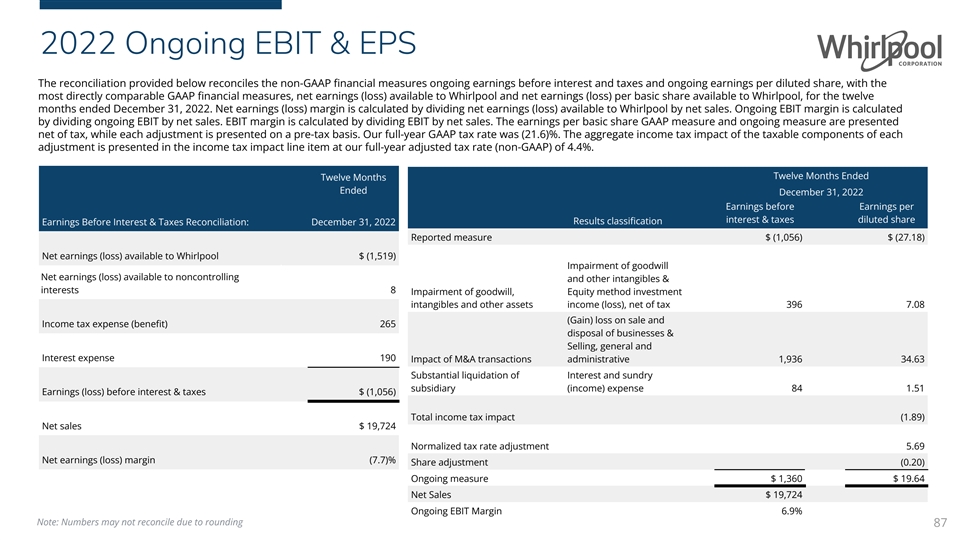 2022 Ongoing EBIT & EPS The reconciliation provided below reconciles the non-GAAP financial measures ongoing earnings before interest and taxes and ongoing earnings per diluted share, with the most directly comparable GAAP financial measures, net earnings (loss) available to Whirlpool and net earnings (loss) per basic share available to Whirlpool, for the twelve months ended December 31, 2022. Net earnings (loss) margin is calculated by dividing net earnings (loss) available to Whirlpool by net sales. Ongoing EBIT margin is calculated by dividing ongoing EBIT by net sales. EBIT margin is calculated by dividing EBIT by net sales. The earnings per basic share GAAP measure and ongoing measure are presented net of tax, while each adjustment is presented on a pre-tax basis. Our full-year GAAP tax rate was (21.6)%. The aggregate income tax impact of the taxable components of each adjustment is presented in the income tax impact line item at our full-year adjusted tax rate (non-GAAP) of 4.4%. Twelve Months Ended Twelve Months Ended December 31, 2022 Earnings before Earnings per interest & taxes diluted share Results classification Earnings Before Interest & Taxes Reconciliation: December 31, 2022 Reported measure $ (1,056) $ (27.18) Net earnings (loss) available to Whirlpool $ (1,519) Impairment of goodwill Net earnings (loss) available to noncontrolling and other intangibles & interests 8 Impairment of goodwill, Equity method investment intangibles and other assets income (loss), net of tax 396 7.08 (Gain) loss on sale and Income tax expense (benefit) 265 disposal of businesses & Selling, general and Interest expense 190 Impact of M&A transactions administrative 1,936 34.63 Substantial liquidation of Interest and sundry subsidiary (income) expense 84 1.51 Earnings (loss) before interest & taxes $ (1,056) Total income tax impact (1.89) Net sales $ 19,724 Normalized tax rate adjustment 5.69 Net earnings (loss) margin (7.7)% Share adjustment (0.20) Ongoing measure $ 1,360 $ 19.64 Net Sales $ 19,724 Ongoing EBIT Margin 6.9% Note: Numbers may not reconcile due to rounding 87