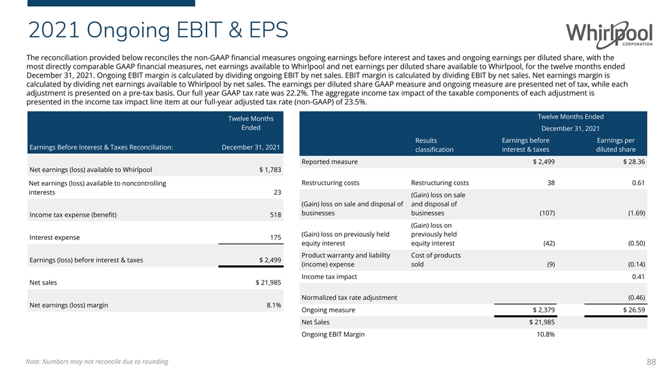 2021 Ongoing EBIT & EPS The reconciliation provided below reconciles the non-GAAP financial measures ongoing earnings before interest and taxes and ongoing earnings per diluted share, with the most directly comparable GAAP financial measures, net earnings available to Whirlpool and net earnings per diluted share available to Whirlpool, for the twelve months ended December 31, 2021. Ongoing EBIT margin is calculated by dividing ongoing EBIT by net sales. EBIT margin is calculated by dividing EBIT by net sales. Net earnings margin is calculated by dividing net earnings available to Whirlpool by net sales. The earnings per diluted share GAAP measure and ongoing measure are presented net of tax, while each adjustment is presented on a pre-tax basis. Our full year GAAP tax rate was 22.2%. The aggregate income tax impact of the taxable components of each adjustment is presented in the income tax impact line item at our full-year adjusted tax rate (non-GAAP) of 23.5%. Twelve Months Ended Twelve Months Ended December 31, 2021 Results Earnings before Earnings per Earnings Before Interest & Taxes Reconciliation: December 31, 2021 interest & taxes diluted share classification Reported measure $ 2,499 $ 28.36 Net earnings (loss) available to Whirlpool $ 1,783 Net earnings (loss) available to noncontrolling Restructuring costs Restructuring costs 38 0.61 interests 23 (Gain) loss on sale (Gain) loss on sale and disposal of and disposal of businesses businesses (107) (1.69) Income tax expense (benefit) 518 (Gain) loss on (Gain) loss on previously held previously held Interest expense 175 equity interest equity interest (42) (0.50) Product warranty and liability Cost of products Earnings (loss) before interest & taxes $ 2,499 (income) expense sold (9) (0.14) Income tax impact 0.41 Net sales $ 21,985 Normalized tax rate adjustment (0.46) Net earnings (loss) margin 8.1% Ongoing measure $ 2,379 $ 26.59 Net Sales $ 21,985 Ongoing EBIT Margin 10.8% Note: Numbers may not reconcile due to rounding 88