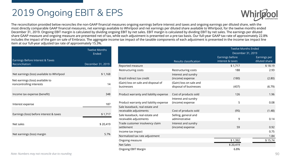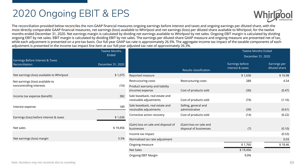 2020 Ongoing EBIT & EPS The reconciliation provided below reconciles the non-GAAP financial measures ongoing earnings before interest and taxes and ongoing earnings per diluted share, with the most directly comparable GAAP financial measures, net earnings (loss) available to Whirlpool and net earnings (loss) per diluted share available to Whirlpool, for the twelve months ended December 31, 2020. Net earnings margin is calculated by dividing net earnings available to Whirlpool by net sales. Ongoing EBIT margin is calculated by dividing ongoing EBIT by net sales. EBIT margin is calculated by dividing EBIT by net sales. The earnings per diluted share GAAP measure and ongoing measure are presented net of tax, while each adjustment is presented on a pre-tax basis. Our full year GAAP tax rate is approximately 26.5%. The aggregate income tax impact of the taxable components of each adjustment is presented in the income tax impact line item at our full-year adjusted tax rate of approximately 26.3%. Twelve Months Twelve Months Ended Ended December 31, 2020 Earnings Before Interest & Taxes Earnings before Earnings per Reconciliation: December 31, 2020 interest & taxes diluted share Results classification Net earnings (loss) available to Whirlpool $ 1,075 Reported measure $ 1,636 $ 16.98 Restructuring costs Restructuring costs 288 4.54 Net earnings (loss) available to noncontrolling interests (10) Product warranty and liability (income) expense Cost of products sold (30) (0.47) Income tax expense (benefit) 382 Sale leaseback, real estate and receivable adjustments Cost of products sold (74) (1.16) Sale leaseback, real estate and Selling, general and Interest expense 189 receivable adjustments administrative (39) (0.61) Corrective action recovery Cost of products sold (14) (0.22) Earnings (loss) before interest & taxes $ 1,636 (Gain) loss on sale and disposal of (Gain) loss on sale and Net sales $ 19,456 businesses disposal of businesses (7) (0.10) Income tax impact (0.53) Net earnings (loss) margin 5.5% Normalized tax rate adjustment 0.03 Ongoing measure $ 1,760 $ 18.46 Net Sales $ 19,456 Ongoing EBIT Margin 9.0% Note: Numbers may not reconcile due to rounding 89