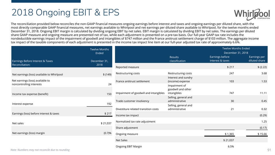 2018 Ongoing EBIT & EPS The reconciliation provided below reconciles the non-GAAP financial measures ongoing earnings before interest and taxes and ongoing earnings per diluted share, with the most directly comparable GAAP financial measures, net earnings available to Whirlpool and net earnings per diluted share available to Whirlpool, for the twelve months ended December 31, 2018. Ongoing EBIT margin is calculated by dividing ongoing EBIT by net sales. EBIT margin is calculated by dividing EBIT by net sales. The earnings per diluted share GAAP measure and ongoing measure are presented net of tax, while each adjustment is presented on a pre-tax basis. Our full-year GAAP tax rate includes the nondeductible earnings impact of the impairment of goodwill and intangibles of $747 million and the France antitrust settlement charge of $103 million. The aggregate income tax impact of the taxable components of each adjustment is presented in the income tax impact line item at our full-year adjusted tax rate of approximately 6.6%. Twelve Months Ended Twelve Months Ended December 31, 2018 Earnings before Earnings per Results interest & taxes diluted share Earnings Before Interest & Taxes December 31, classification Reconciliation: 2018 Reported measure $ 217 $ (2.22) Restructuring costs Restructuring costs 247 3.68 Net earnings (loss) available to Whirlpool $ (149) Interest and sundry Net earnings (loss) available to France antitrust settlement (income) expense 103 1.53 noncontrolling interests 24 Impairment of goodwill and other Impairment of goodwill and intangibles intangibles 747 11.11 Income tax expense (benefit) 150 Selling, general and Trade customer insolvency administrative 30 0.45 Interest expense 192 Selling, general and Divestiture related transition costs administrative 21 0.32 Earnings (loss) before interest & taxes $ 217 Income tax impact (0.29) Normalized tax rate adjustment 1.25 Net sales $ 21,037 Share adjustment (0.17) Net earnings (loss) margin (0.7)% Ongoing measure $ 1,365 $ 15.66 Net Sales $ 21,037 Ongoing EBIT Margin 6.5% Note: Numbers may not reconcile due to rounding 91