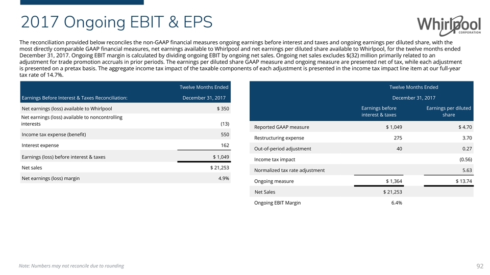2017 Ongoing EBIT & EPS The reconciliation provided below reconciles the non-GAAP financial measures ongoing earnings before interest and taxes and ongoing earnings per diluted share, with the most directly comparable GAAP financial measures, net earnings available to Whirlpool and net earnings per diluted share available to Whirlpool, for the twelve months ended December 31, 2017. Ongoing EBIT margin is calculated by dividing ongoing EBIT by ongoing net sales. Ongoing net sales excludes $(32) million primarily related to an adjustment for trade promotion accruals in prior periods. The earnings per diluted share GAAP measure and ongoing measure are presented net of tax, while each adjustment is presented on a pretax basis. The aggregate income tax impact of the taxable components of each adjustment is presented in the income tax impact line item at our full-year tax rate of 14.7%. Twelve Months Ended Twelve Months Ended Earnings Before Interest & Taxes Reconciliation: December 31, 2017 December 31, 2017 Earnings before Earnings per diluted Net earnings (loss) available to Whirlpool $ 350 interest & taxes share Net earnings (loss) available to noncontrolling interests (13) Reported GAAP measure $ 1,049 $ 4.70 Income tax expense (benefit) 550 Restructuring expense 275 3.70 Interest expense 162 Out-of-period adjustment 40 0.27 Earnings (loss) before interest & taxes $ 1,049 Income tax impact (0.56) Net sales $ 21,253 Normalized tax rate adjustment 5.63 Net earnings (loss) margin 4.9% Ongoing measure $ 1,364 $ 13.74 Net Sales $ 21,253 Ongoing EBIT Margin 6.4% Note: Numbers may not reconcile due to rounding 92