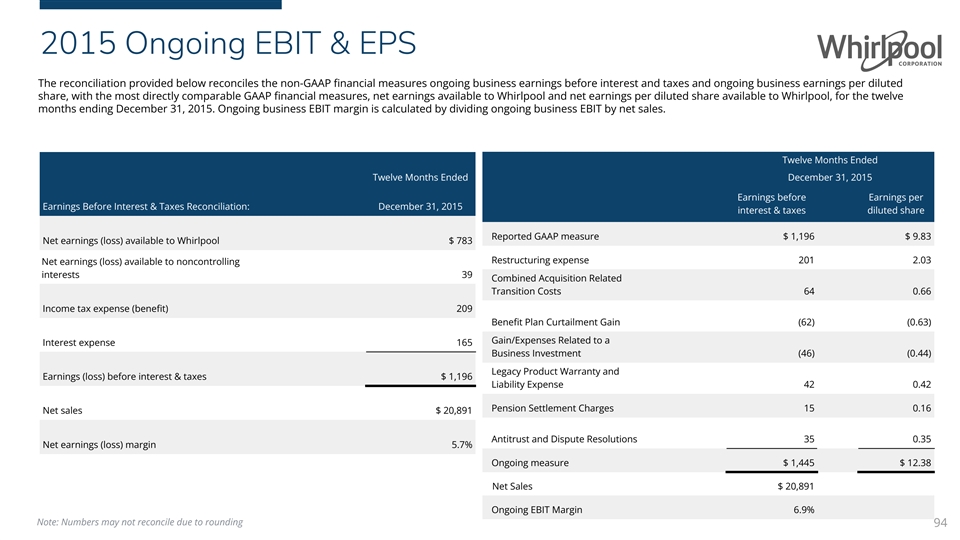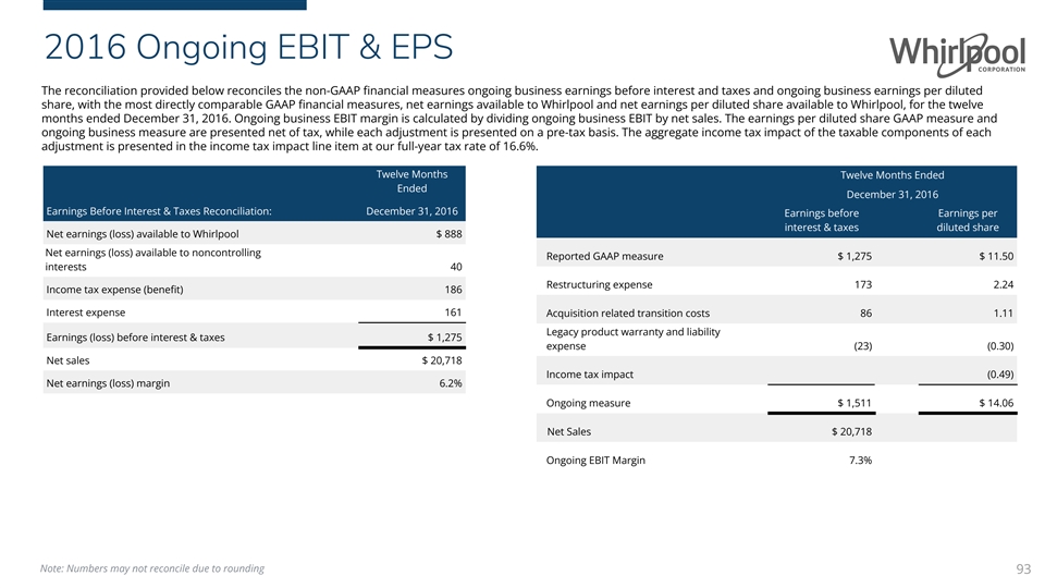 2016 Ongoing EBIT & EPS The reconciliation provided below reconciles the non-GAAP financial measures ongoing business earnings before interest and taxes and ongoing business earnings per diluted share, with the most directly comparable GAAP financial measures, net earnings available to Whirlpool and net earnings per diluted share available to Whirlpool, for the twelve months ended December 31, 2016. Ongoing business EBIT margin is calculated by dividing ongoing business EBIT by net sales. The earnings per diluted share GAAP measure and ongoing business measure are presented net of tax, while each adjustment is presented on a pre-tax basis. The aggregate income tax impact of the taxable components of each adjustment is presented in the income tax impact line item at our full-year tax rate of 16.6%. Twelve Months Twelve Months Ended Ended December 31, 2016 Earnings Before Interest & Taxes Reconciliation: December 31, 2016 Earnings before Earnings per interest & taxes diluted share Net earnings (loss) available to Whirlpool $ 888 Net earnings (loss) available to noncontrolling Reported GAAP measure $ 1,275 $ 11.50 interests 40 Restructuring expense 173 2.24 Income tax expense (benefit) 186 Interest expense 161 Acquisition related transition costs 86 1.11 Legacy product warranty and liability Earnings (loss) before interest & taxes $ 1,275 expense (23) (0.30) Net sales $ 20,718 Income tax impact (0.49) Net earnings (loss) margin 6.2% Ongoing measure $ 1,511 $ 14.06 Net Sales $ 20,718 Ongoing EBIT Margin 7.3% Note: Numbers may not reconcile due to rounding 93