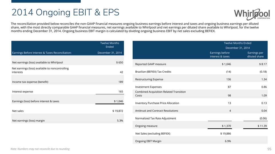 2014 Ongoing EBIT & EPS The reconciliation provided below reconciles the non-GAAP financial measures ongoing business earnings before interest and taxes and ongoing business earnings per diluted share, with the most directly comparable GAAP financial measures, net earnings available to Whirlpool and net earnings per diluted share available to Whirlpool, for the twelve months ending December 31, 2014. Ongoing business EBIT margin is calculated by dividing ongoing business EBIT by net sales excluding BEFIEX. Twelve Months Twelve Months Ended Ended December 31, 2014 Earnings Before Interest & Taxes Reconciliation: December 31, 2014 Earnings before Earnings per interest & taxes diluted share Net earnings (loss) available to Whirlpool $ 650 Reported GAAP measure $ 1,046 $ 8.17 Net earnings (loss) available to noncontrolling Brazilian (BEFIEX) Tax Credits (14) (0.18) interests 42 Restructuring Expense 136 1.34 Income tax expense (benefit) 189 Investment Expenses 87 0.86 Interest expense 165 Combined Acquisition Related Transition Costs 98 1.09 Earnings (loss) before interest & taxes $ 1,046 Inventory Purchase Price Allocation 13 0.13 Net sales $ 19,872 Antitrust and Contract Resolutions 4 0.04 Normalized Tax Rate Adjustment (0.06) Net earnings (loss) margin 5.3% Ongoing measure $ 1,370 $ 11.39 Net Sales (excluding BEFIEX) $ 19,886 Ongoing EBIT Margin 6.9% Note: Numbers may not reconcile due to rounding 95