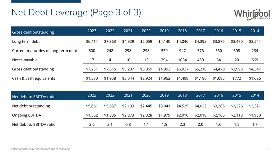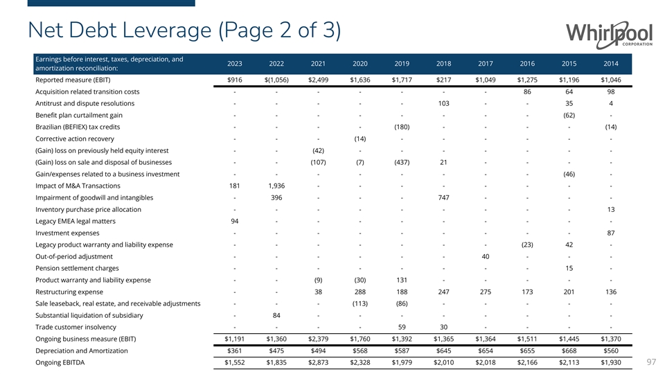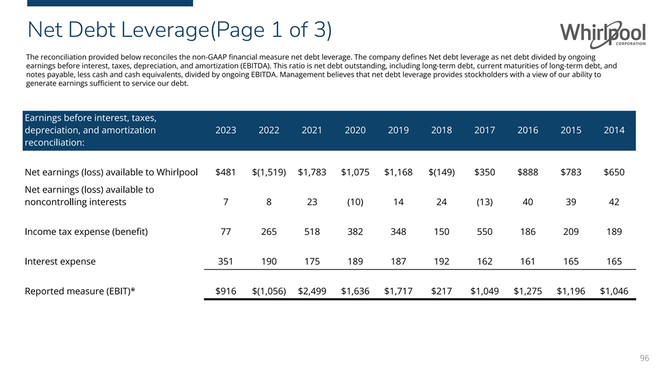 Net Debt Leverage(Page 1 of 3) The reconciliation provided below reconciles the non-GAAP financial measure net debt leverage. The company defines Net debt leverage as net debt divided by ongoing earnings before interest, taxes, depreciation, and amortization (EBITDA). This ratio is net debt outstanding, including long-term debt, current maturities of long-term debt, and notes payable, less cash and cash equivalents, divided by ongoing EBITDA. Management believes that net debt leverage provides stockholders with a view of our ability to generate earnings sufficient to service our debt. Earnings before interest, taxes, depreciation, and amortization 2023 2022 2021 2020 2019 2018 2017 2016 2015 2014 reconciliation: Net earnings (loss) available to Whirlpool $481 $(1,519) $1,783 $1,075 $1,168 $(149) $350 $888 $783 $650 Net earnings (loss) available to noncontrolling interests 7 8 23 (10) 14 24 (13) 40 39 42 Income tax expense (benefit) 77 265 518 382 348 150 550 186 209 189 Interest expense 351 190 175 189 187 192 162 161 165 165 Reported measure (EBIT)* $916 $(1,056) $2,499 $1,636 $1,717 $217 $1,049 $1,275 $1,196 $1,046 96