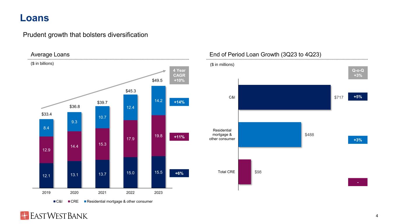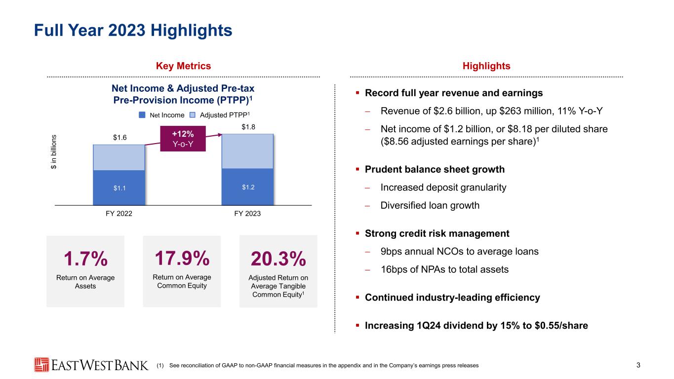 Forward-Looking Statements 2 Forward-Looking Statements This presentation contains forward-looking statements that are intended to be covered by the safe harbor for such statements provided by the Private Securities Litigation Reform Act of 1995. These statements are based on the current beliefs and expectations of the management of East West Bancorp, Inc. (the “Company”) and are subject to significant risks and uncertainties. You should not place undue reliance on these statements. There are various important factors that could cause the Company’s future results to differ materially from historical performance and any forward-looking statements, including the factors described in the Company’s fourth-quarter 2023 earnings release, as well as those factors contained in the Company’s filings with the Securities and Exchange Commission, including the “Risk Factors” section of the Company’s Annual Report on Form 10-K for the year ended December 31, 2022 and in its subsequent Quarterly Reports on Form 10-Q. When considering these forward-looking statements, you should keep in mind these risks and uncertainties, as well as any cautionary statements the Company may make. These statements speak only as of the date they are made and are based only on information then actually known to the Company. The Company does not undertake to update any forward-looking statements except as required by law. Non-GAAP Financial Measures Certain financial information in this presentation has not been prepared in accordance with U.S. generally accepted accounting principles (“GAAP”) and is presented on a non-GAAP basis. Investors should refer to the reconciliations included in this presentation and should consider the Company’s non-GAAP measures in addition to, not as a substitute for or superior to, measures prepared in accordance with GAAP. These measures may not be comparable to similarly titled measures used by other companies.