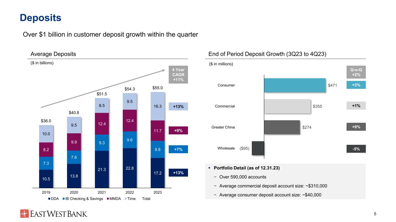 Loans 4 Prudent growth that bolsters diversification ($ in billions) Average Loans End of Period Loan Growth (3Q23 to 4Q23) ($ in millions) +5% - +3% Q-o-Q +3% $98 $488 $717 Total CRE Residential mortgage & other consumer C&I 12.1 13.1 13.7 15.0 15.5 12.9 14.4 15.3 17.9 19.8 8.4 9.3 10.7 12.4 14.2 $33.4 $36.8 $39.7 $45.3 $49.5 2019 2020 2021 2022 2023 C&I CRE Residential mortgage & other consumer +6% +11% +14% 4 Year CAGR +10%