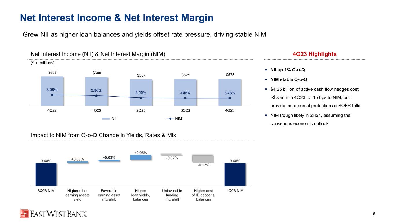 ($95) $274 $355 $471 Wholesale Greater China Commercial Consumer Deposits 5 Over $1 billion in customer deposit growth within the quarter ($ in billions) Average Deposits End of Period Deposit Growth (3Q23 to 4Q23) ($ in millions) ▪ Portfolio Detail (as of 12.31.23) − Over 590,000 accounts − Average commercial deposit account size: ~$310,000 − Average consumer deposit account size: ~$40,000 10.5 13.8 21.3 22.8 17.2 7.3 7.6 9.3 9.6 9.88.2 9.9 12.4 12.4 11.7 10.0 9.5 8.5 9.5 16.3 $36.0 $40.8 $51.5 $54.3 $55.0 2019 2020 2021 2022 2023 DDA IB Checking & Savings MMDA Time Total +13% +7% +13% +9% 4 Year CAGR +11% +3% +9% +1% Q-o-Q +2% -5%