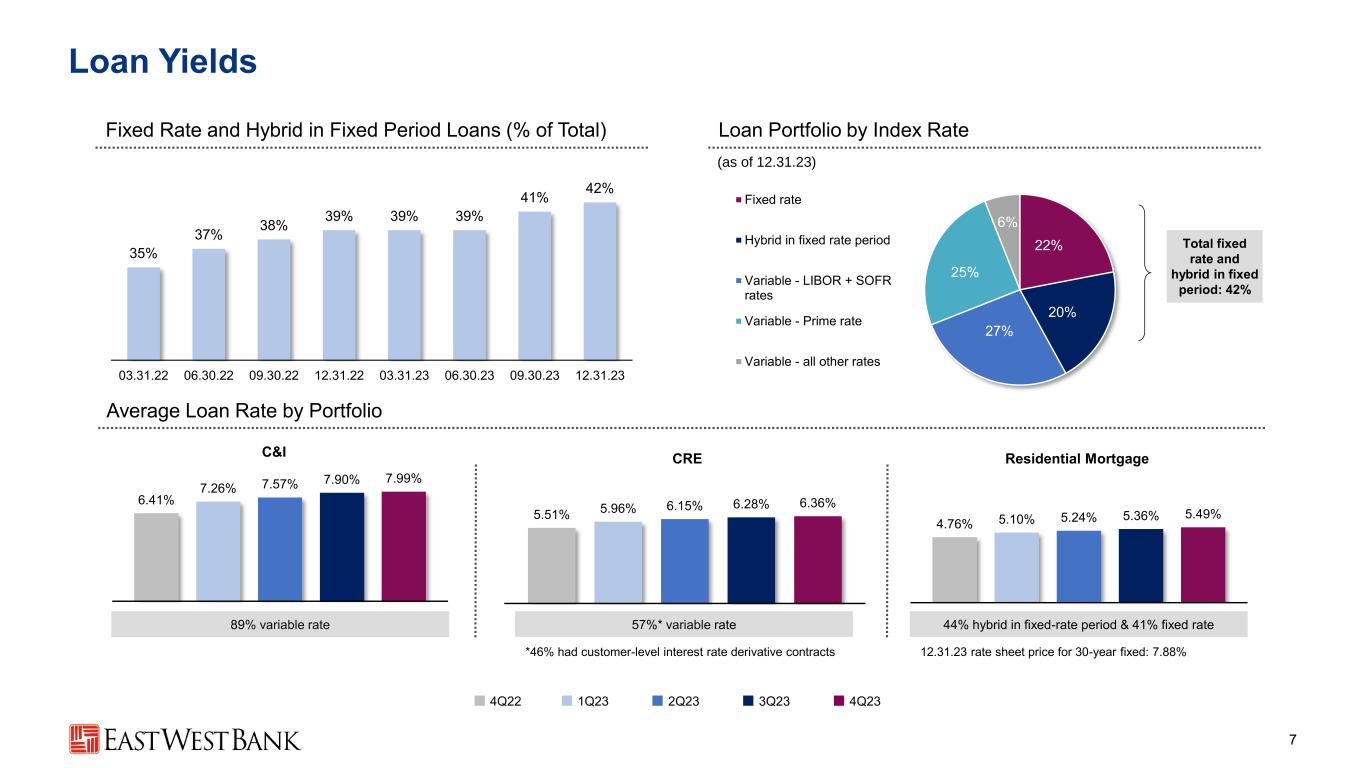 Net Interest Income & Net Interest Margin 6 Grew NII as higher loan balances and yields offset rate pressure, driving stable NIM ▪ NII up 1% Q-o-Q ▪ NIM stable Q-o-Q ▪ $4.25 billion of active cash flow hedges cost ~$25mm in 4Q23, or 15 bps to NIM, but provide incremental protection as SOFR falls ▪ NIM trough likely in 2H24, assuming the consensus economic outlook 4Q23 HighlightsNet Interest Income (NII) & Net Interest Margin (NIM) Impact to NIM from Q-o-Q Change in Yields, Rates & Mix $606 $600 $567 $571 $575 3.98% 3.96% 3.55% 3.48% 3.48% 4Q22 1Q23 2Q23 3Q23 4Q23 NII NIM ($ in millions)