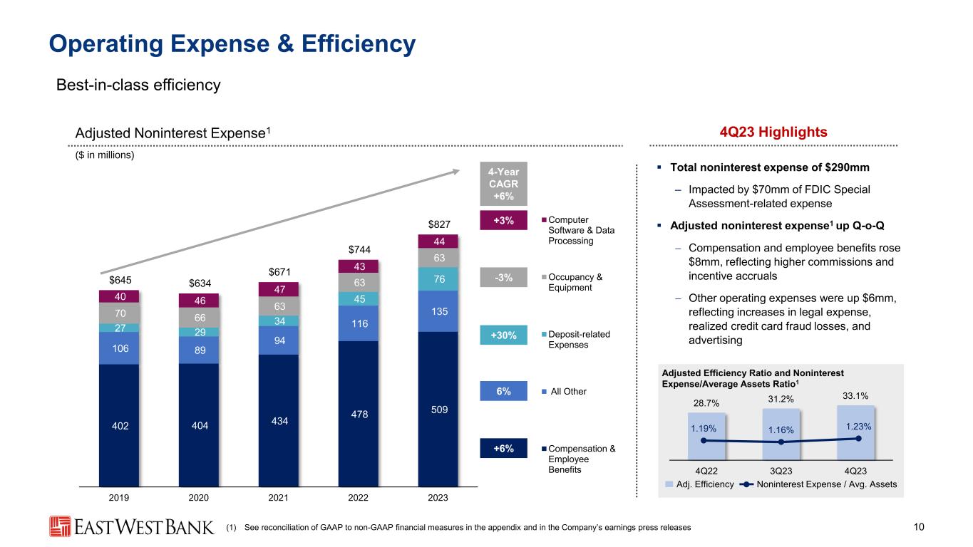 38 48 71 88 90 64 75 78 79 84 26 22 49 48 52 17 18 26 28 27 42 40 11 15 23 $187 $203 $235 $258 $276 2019 2020 2021 2022 2023 Fees and Noninterest Income 9 Customer and Other Derivative Income Detail ($mm) 4Q22 3Q23 4Q23 Revenue $ 4.0 $ 5.9 $ 6.3 MTM (4.6) 5.3 (7.2) Total $ (0.6) $ 11.2 $ (1.0) Greater customer activity drove an increase in fee income within the quarter ▪ Fee income1 of $73mm in 4Q23, up $6mm, or 9% from $67mm in 3Q23 ▪ Foreign exchange income, wealth management fees, and lending fees each increased $2mm, reflecting higher customer activity ▪ Total noninterest income of $80mm in 4Q23 also included a net gain on sale of loans of $4mm; net gain on AFS debt security of $3mm 4Q23 Highlights (1) Fee income excludes mark-to-market adjustments related to customer and other derivatives; net gains on sales of loans; net gains on sales of securities; other investment income and other income Fee Income1 ($ in millions) +23% +7% -14% +13% 4-Year CAGR +10% +19% Customer Derivative Income Wealth Management Fees Foreign Exchange Income Lending Fees Deposit Account Fees