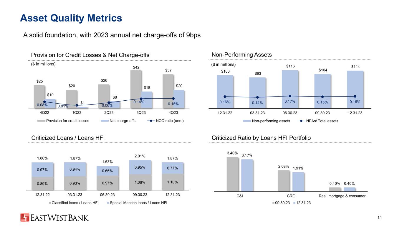 402 404 434 478 509 106 89 94 116 135 27 29 34 45 76 70 66 63 63 63 40 46 47 43 44 $645 $634 $671 $744 $827 2019 2020 2021 2022 2023 Computer Software & Data Processing Occupancy & Equipment Deposit-related Expenses All Other Compensation & Employee Benefits 28.7% 31.2% 33.1% 4Q22 3Q23 4Q23 Operating Expense & Efficiency 10 Best-in-class efficiency Adjusted Noninterest Expense1 ($ in millions) ▪ Total noninterest expense of $290mm ‒ Impacted by $70mm of FDIC Special Assessment-related expense ▪ Adjusted noninterest expense1 up Q-o-Q − Compensation and employee benefits rose $8mm, reflecting higher commissions and incentive accruals − Other operating expenses were up $6mm, reflecting increases in legal expense, realized credit card fraud losses, and advertising (1) See reconciliation of GAAP to non-GAAP financial measures in the appendix and in the Company’s earnings press releases 4Q23 Highlights 4-Year CAGR +6% +6% +3% -3% Adjusted Efficiency Ratio and Noninterest Expense/Average Assets Ratio1 Adj. Efficiency Noninterest Expense / Avg. Assets 6% +30% 1.19% 1.16% 1.23%