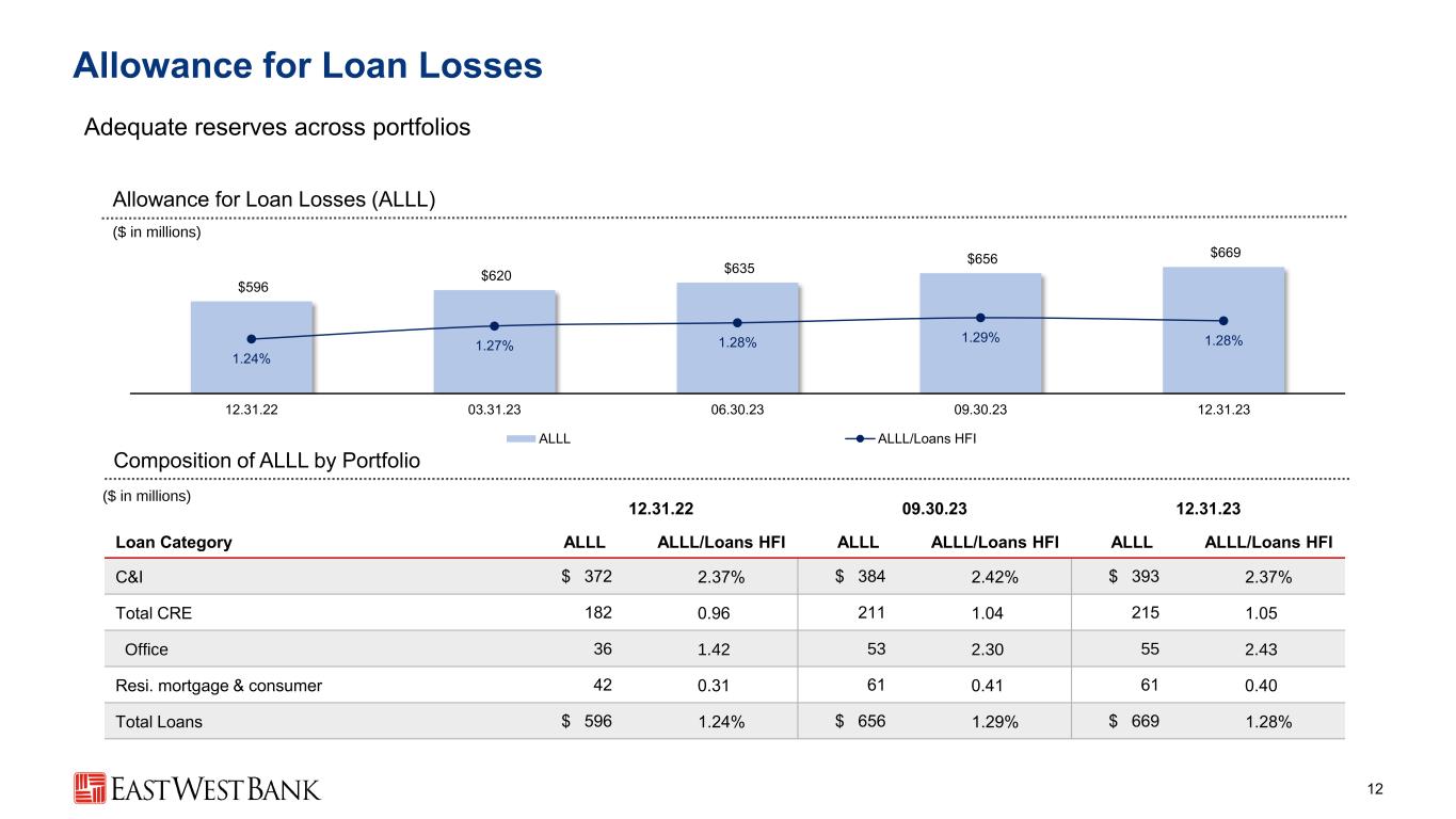 0.89% 0.93% 0.97% 1.06% 1.10% 0.97% 0.94% 0.66% 0.95% 0.77% 1.86% 1.87% 1.63% 2.01% 1.87% 12.31.22 03.31.23 06.30.23 09.30.23 12.31.23 Classified loans / Loans HFI Special Mention loans / Loans HFI Asset Quality Metrics 11 A solid foundation, with 2023 annual net charge-offs of 9bps Provision for Credit Losses & Net Charge-offs ($ in millions) Non-Performing Assets Criticized Loans / Loans HFI Criticized Ratio by Loans HFI Portfolio ($ in millions) $25 $20 $26 $42 $37 $10 $1 $8 $18 $20 0.08% 0.01% 0.06% 0.14% 0.15% 4Q22 1Q23 2Q23 3Q23 4Q23 Provision for credit losses Net charge-offs NCO ratio (ann.) $100 $93 $116 $104 $114 0.16% 0.14% 0.17% 0.15% 0.16% 12.31.22 03.31.23 06.30.23 09.30.23 12.31.23 Non-performing assets NPAs/ Total assets 3.40% 2.08% 0.40% 3.17% 1.91% 0.40% C&I CRE Resi. mortgage & consumer 09.30.23 12.31.23