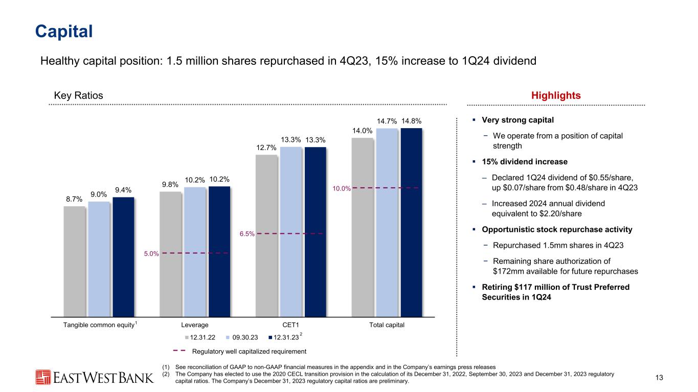 Capital Healthy capital position: 1.5 million shares repurchased in 4Q23, 15% increase to 1Q24 dividend Highlights ▪ Very strong capital − We operate from a position of capital strength ▪ 15% dividend increase ‒ Declared 1Q24 dividend of $0.55/share, up $0.07/share from $0.48/share in 4Q23 ‒ Increased 2024 annual dividend equivalent to $2.20/share ▪ Opportunistic stock repurchase activity − Repurchased 1.5mm shares in 4Q23 − Remaining share authorization of $172mm available for future repurchases ▪ Retiring $117 million of Trust Preferred Securities in 1Q24 8.7% 9.8% 12.7% 14.0% 9.0% 10.2% 13.3% 14.7% 9.4% 10.2% 13.3% 14.8% Tangible common equity Leverage CET1 Total capital 12.31.22 09.30.23 12.31.23 Regulatory well capitalized requirement (1) See reconciliation of GAAP to non-GAAP financial measures in the appendix and in the Company’s earnings press releases (2) The Company has elected to use the 2020 CECL transition provision in the calculation of its December 31, 2022, September 30, 2023 and December 31, 2023 regulatory capital ratios. The Company’s December 31, 2023 regulatory capital ratios are preliminary. 2 5.0% 6.5% 10.0% 13 1 Key Ratios