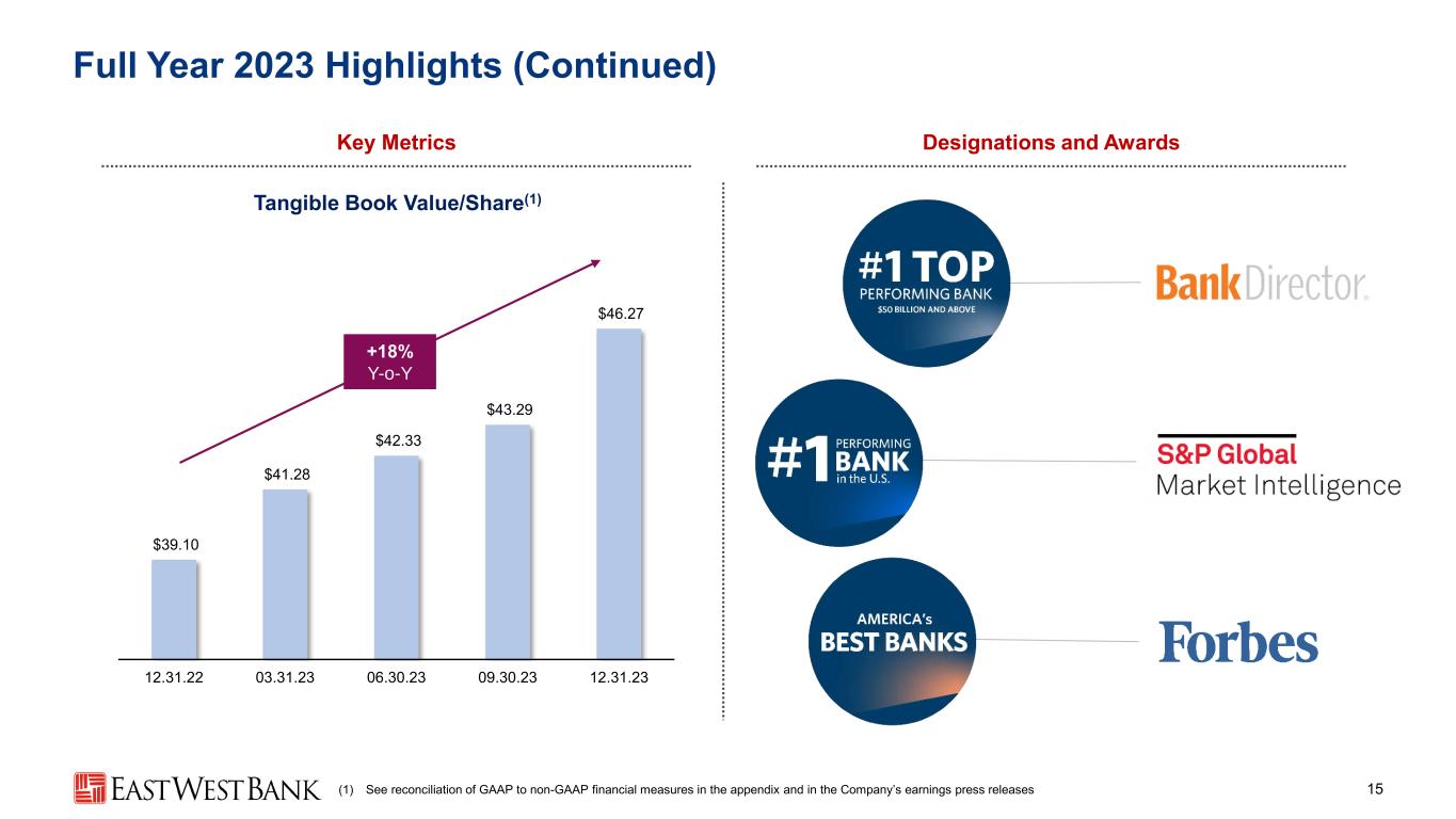 Management Outlook: Full Year 2024 14 Earnings Drivers FY 2024 Expectations vs. FY 2023 Results Economic and Interest Rate Outlook ▪ Softening economy with modest growth ▪ Assuming a year-end forward curve with cuts beginning in Q2 End of Period Loans ▪ Growing in the range of 3% to 5% Y-o-Y Net Interest Income ▪ Declining in the range of 4% to 6% Y-o-Y, driven by rate cuts Adjusted Noninterest Expense1 ▪ Increasing in the range of 6% to 8% Y-o-Y, driven primarily by compensation and benefits expense, offset partly by lower deposit- account expense Net Charge-offs ▪ 1Q24 in line with 4Q23, with subsequent quarters increasing modestly ▪ Subsequent quarters in the range of 15 to 25 bps Effective Tax Rate ▪ To increase modestly Best-in-Class Efficiency Top Quartile Returns FY 2024 Expectation (1) See reconciliation of GAAP to non-GAAP financial measures in the appendix and in the Company’s earnings press releases