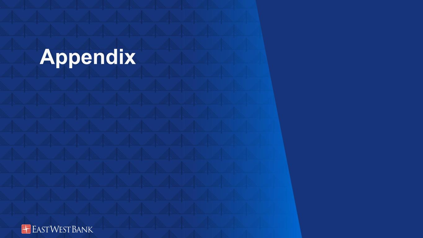 Appendix: GAAP to Non-GAAP Reconciliation 23 EAST WEST BANCORP, INC. AND SUBSIDIARIES GAAP TO NON-GAAP RECONCILIATION ($ in thousands) (unaudited) The Company uses certain non-GAAP financial measures to provide supplemental information regarding the Company’s performance. Tangible book value, tangible book value per share and TCE ratio are non- GAAP financial measures. Tangible book value and tangible assets represent stockholders’ equity and total assets, respectively, which have been reduced by goodwill and other intangible assets. Given that the use of such measures and ratios is more prevalent in the banking industry, and such measures and ratios are used by banking regulators and analysts, the Company has included them below for discussion. (1) Includes core deposit intangibles and mortgage servicing assets.