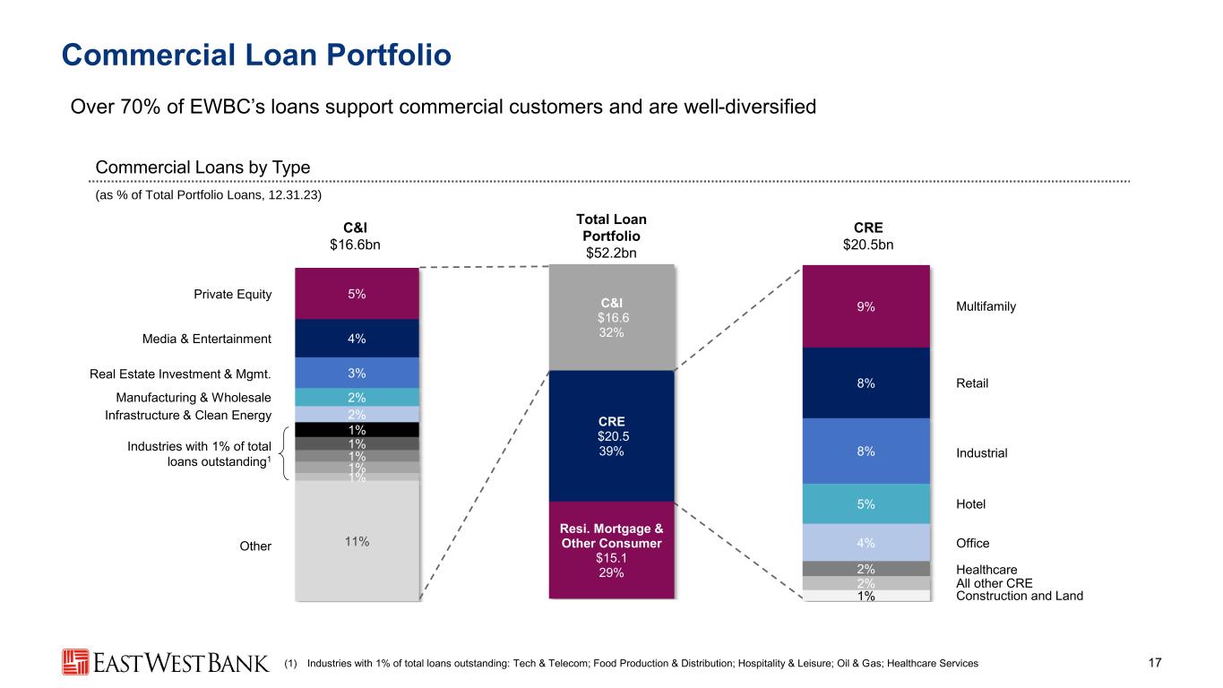 11% 1% 1% 1% 1% 1% 2% 2% 3% 4% 5% Industries with 1% of total loans outstanding1 Commercial Loan Portfolio 17 Over 70% of EWBC’s loans support commercial customers and are well-diversified CRE $20.5bn C&I $16.6bn (as % of Total Portfolio Loans, 12.31.23) Commercial Loans by Type Total Loan Portfolio $52.2bn Resi. Mortgage & Other Consumer $15.1 29% CRE $20.5 39% C&I $16.6 32% (1) Industries with 1% of total loans outstanding: Tech & Telecom; Food Production & Distribution; Hospitality & Leisure; Oil & Gas; Healthcare Services Private Equity Media & Entertainment Real Estate Investment & Mgmt. Manufacturing & Wholesale Infrastructure & Clean Energy Other 1% 2% 2% 4% 5% 8% 8% 9% Industrial Multifamily Retail Hotel Office Healthcare All other CRE Construction and Land