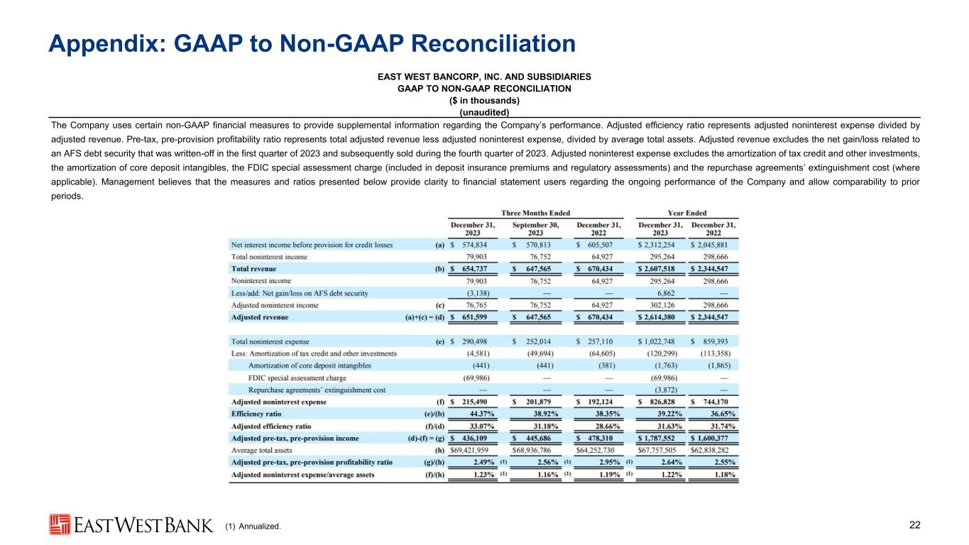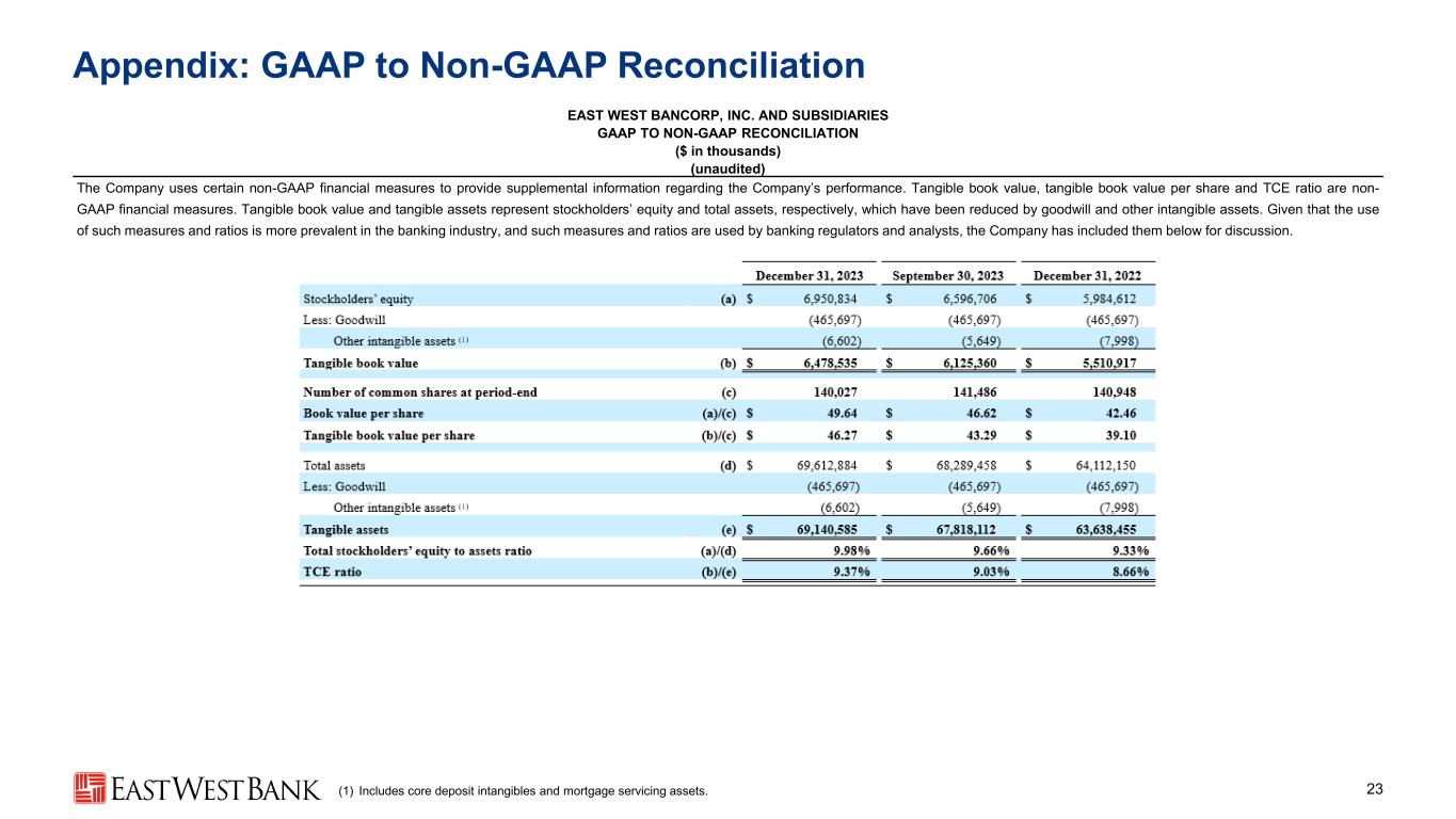 Appendix: GAAP to Non-GAAP Reconciliation 22 EAST WEST BANCORP, INC. AND SUBSIDIARIES GAAP TO NON-GAAP RECONCILIATION ($ in thousands) (unaudited) The Company uses certain non-GAAP financial measures to provide supplemental information regarding the Company’s performance. Adjusted efficiency ratio represents adjusted noninterest expense divided by adjusted revenue. Pre-tax, pre-provision profitability ratio represents total adjusted revenue less adjusted noninterest expense, divided by average total assets. Adjusted revenue excludes the net gain/loss related to an AFS debt security that was written-off in the first quarter of 2023 and subsequently sold during the fourth quarter of 2023. Adjusted noninterest expense excludes the amortization of tax credit and other investments, the amortization of core deposit intangibles, the FDIC special assessment charge (included in deposit insurance premiums and regulatory assessments) and the repurchase agreements’ extinguishment cost (where applicable). Management believes that the measures and ratios presented below provide clarity to financial statement users regarding the ongoing performance of the Company and allow comparability to prior periods. (1) Annualized.
