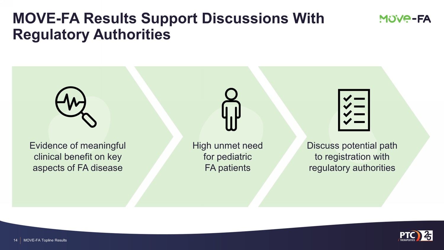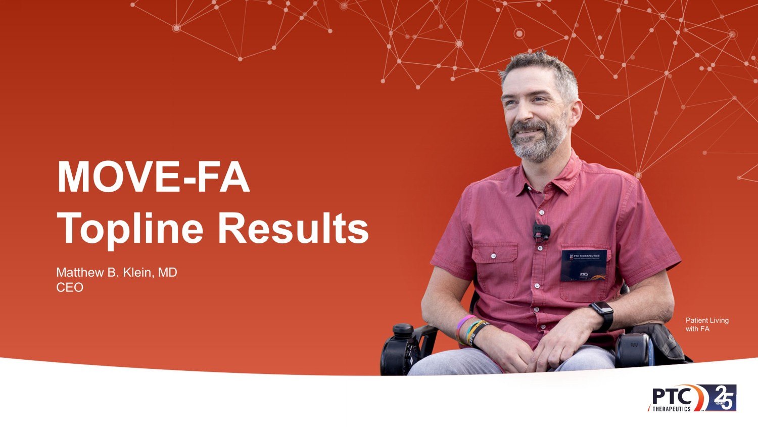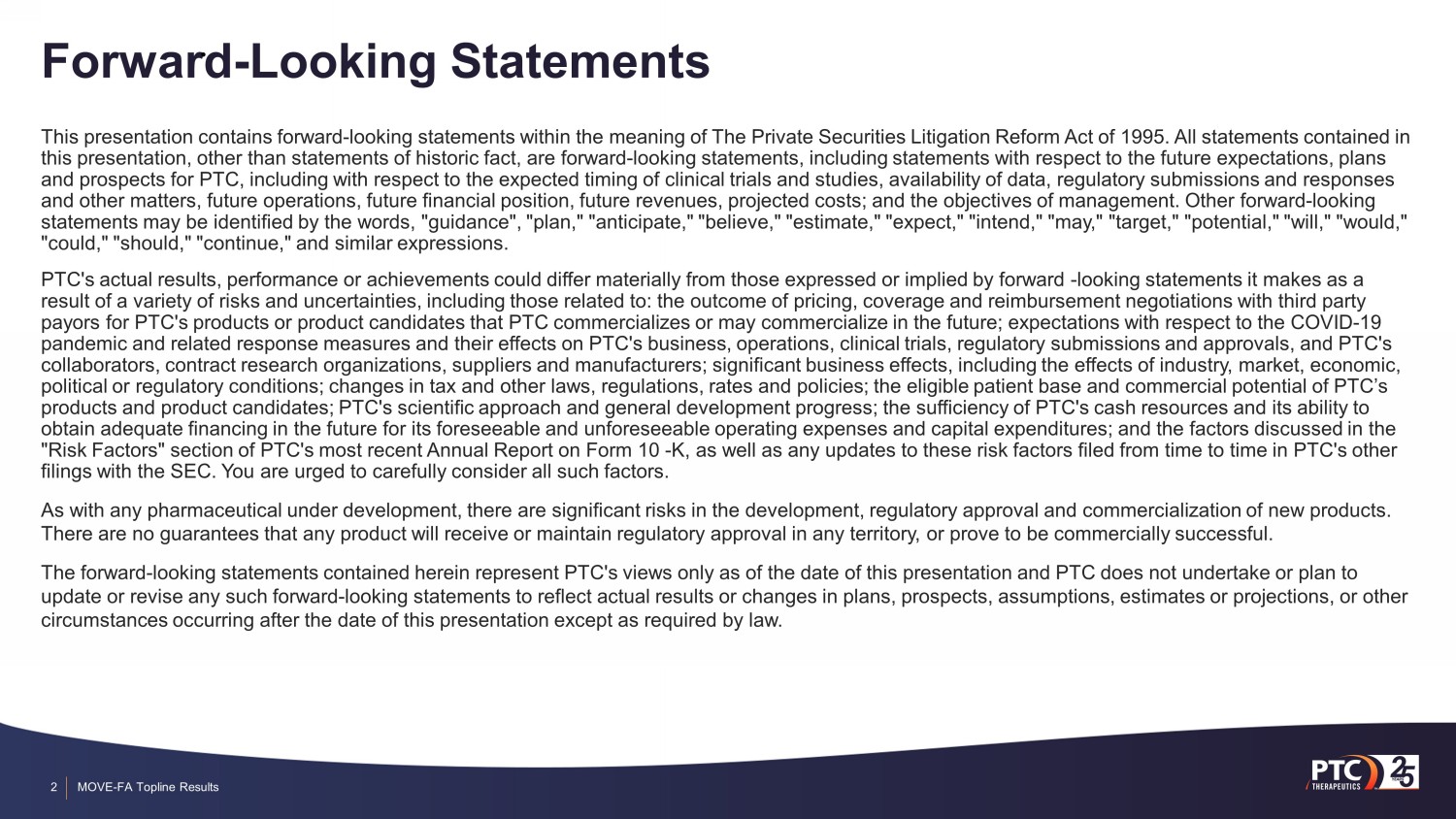 Forward - Looking Statements 2 This presentation contains forward - looking statements within the meaning of The Private Securities Litigation Reform Act of 1995 . All statements contained in this presentation, other than statements of historic fact, are forward - looking statements, including statements with respect to the future expectations, plans and prospects for PTC, including with respect to the expected timing of clinical trials and studies, availability of data, regul atory submissions and responses and other matters, future operations, future financial position, future revenues, projected costs; and the objectives of managem ent. Other forward - looking statements may be identified by the words, "guidance", "plan," "anticipate," "believe," "estimate," "expect," "intend," "may," " target," "potential," "will," "would," "could," "should," "continue," and similar expressions. PTC's actual results, performance or achievements could differ materially from those expressed or implied by forward - looking st atements it makes as a result of a variety of risks and uncertainties, including those related to: the outcome of pricing, coverage and reimbursement n egotiations with third party payors for PTC's products or product candidates that PTC commercializes or may commercialize in the future; expectations with re spect to the COVID - 19 pandemic and related response measures and their effects on PTC's business, operations, clinical trials, regulatory submissions and approvals, and PTC's collaborators, contract research organizations, suppliers and manufacturers; significant business effects, including the effe cts of industry, market, economic, political or regulatory conditions; changes in tax and other laws, regulations, rates and policies; the eligible patient base an d commercial potential of PTC’s products and product candidates; PTC's scientific approach and general development progress; the sufficiency of PTC's cash re sou rces and its ability to obtain adequate financing in the future for its foreseeable and unforeseeable operating expenses and capital expenditures; and t he factors discussed in the "Risk Factors" section of PTC's most recent Annual Report on Form 10 - K, as well as any updates to these risk factors filed from time to time in PTC's other filings with the SEC. You are urged to carefully consider all such factors. As with any pharmaceutical under development, there are significant risks in the development, regulatory approval and commerc ial ization of new products. There are no guarantees that any product will receive or maintain regulatory approval in any territory, or prove to be commer cia lly successful. The forward - looking statements contained herein represent PTC's views only as of the date of this presentation and PTC does not undertake or plan to update or revise any such forward - looking statements to reflect actual results or changes in plans, prospects, assumptions, esti mates or projections, or other circumstances occurring after the date of this presentation except as required by law. MOVE - FA Topline Results