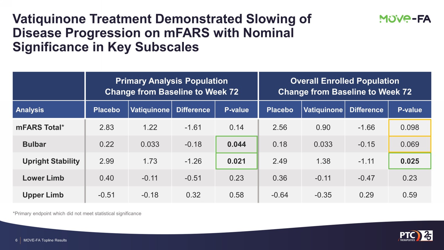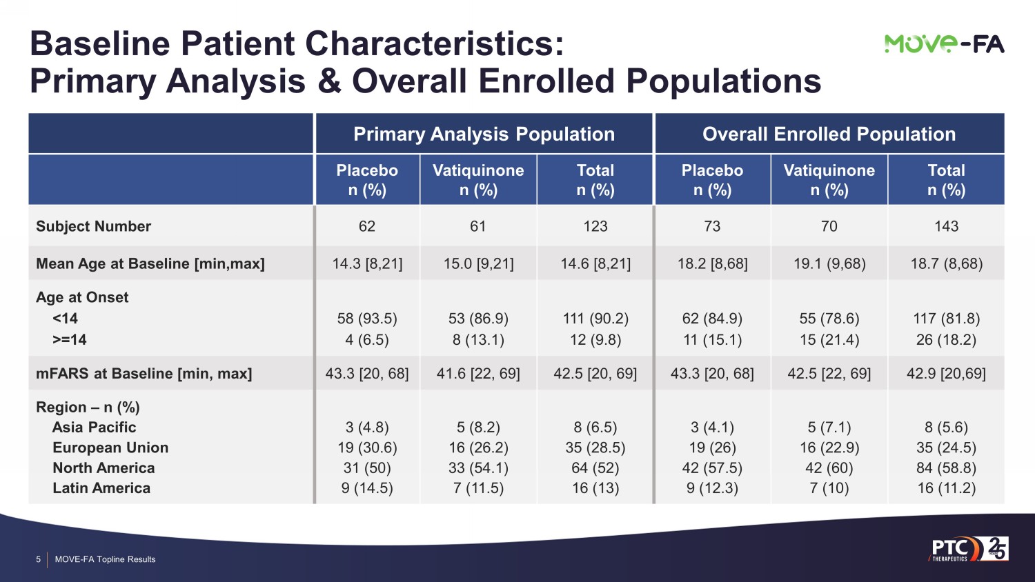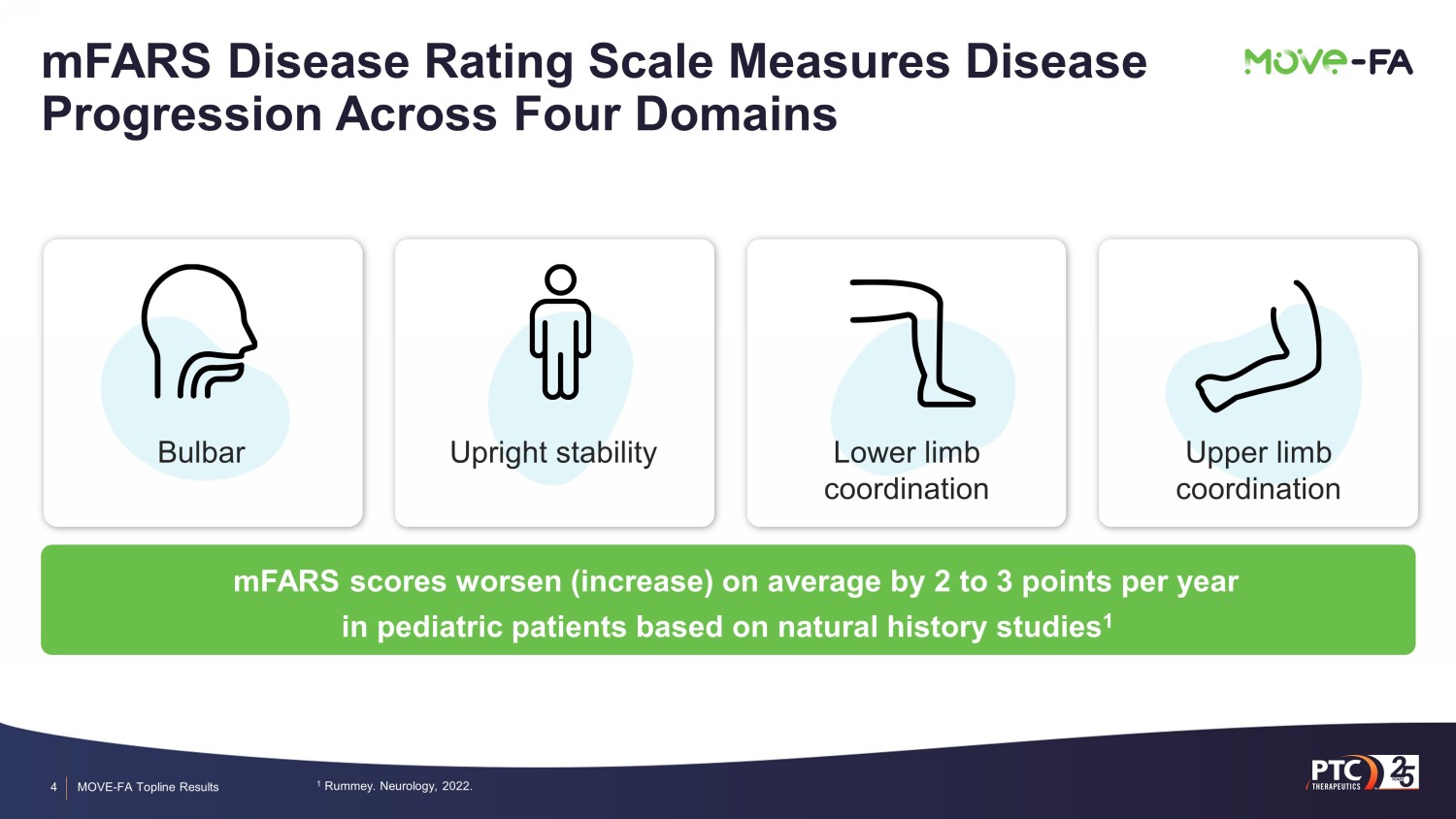 Forward - Looking Statements 2 This presentation contains forward - looking statements within the meaning of The Private Securities Litigation Reform Act of 1995 . All statements contained in this presentation, other than statements of historic fact, are forward - looking statements, including statements with respect to the future expectations, plans and prospects for PTC, including with respect to the expected timing of clinical trials and studies, availability of data, regul atory submissions and responses and other matters, future operations, future financial position, future revenues, projected costs; and the objectives of managem ent. Other forward - looking statements may be identified by the words, "guidance", "plan," "anticipate," "believe," "estimate," "expect," "intend," "may," " target," "potential," "will," "would," "could," "should," "continue," and similar expressions. PTC's actual results, performance or achievements could differ materially from those expressed or implied by forward - looking st atements it makes as a result of a variety of risks and uncertainties, including those related to: the outcome of pricing, coverage and reimbursement n egotiations with third party payors for PTC's products or product candidates that PTC commercializes or may commercialize in the future; expectations with re spect to the COVID - 19 pandemic and related response measures and their effects on PTC's business, operations, clinical trials, regulatory submissions and approvals, and PTC's collaborators, contract research organizations, suppliers and manufacturers; significant business effects, including the effe cts of industry, market, economic, political or regulatory conditions; changes in tax and other laws, regulations, rates and policies; the eligible patient base an d commercial potential of PTC’s products and product candidates; PTC's scientific approach and general development progress; the sufficiency of PTC's cash re sou rces and its ability to obtain adequate financing in the future for its foreseeable and unforeseeable operating expenses and capital expenditures; and t he factors discussed in the "Risk Factors" section of PTC's most recent Annual Report on Form 10 - K, as well as any updates to these risk factors filed from time to time in PTC's other filings with the SEC. You are urged to carefully consider all such factors. As with any pharmaceutical under development, there are significant risks in the development, regulatory approval and commerc ial ization of new products. There are no guarantees that any product will receive or maintain regulatory approval in any territory, or prove to be commer cia lly successful. The forward - looking statements contained herein represent PTC's views only as of the date of this presentation and PTC does not undertake or plan to update or revise any such forward - looking statements to reflect actual results or changes in plans, prospects, assumptions, esti mates or projections, or other circumstances occurring after the date of this presentation except as required by law. MOVE - FA Topline Results