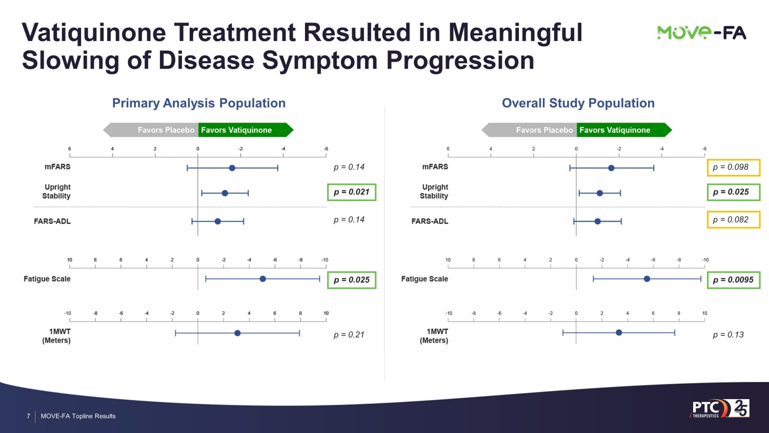Vatiquinone Treatment Demonstrated Slowing of Disease Progression on mFARS with Nominal Significance in Key Subscales MOVE - FA Topline Results 6 Primary Analysis Population Change from Baseline to Week 72 Overall Enrolled Population Change from Baseline to Week 72 Analysis Placebo Vatiquinone Difference P - value Placebo Vatiquinone Difference P - value mFARS Total * 2.83 1.22 - 1.61 0.14 2.56 0.90 - 1.66 0.098 Bulbar 0.22 0.033 - 0.18 0.044 0.18 0.033 - 0.15 0.069 Upright Stability 2.99 1.73 - 1.26 0.021 2.49 1.38 - 1.11 0.025 Lower Limb 0.40 - 0.11 - 0.51 0.23 0.36 - 0.11 - 0.47 0.23 Upper Limb - 0.51 - 0.18 0.32 0.58 - 0.64 - 0.35 0.29 0.59 *Primary endpoint which did not meet statistical significance
