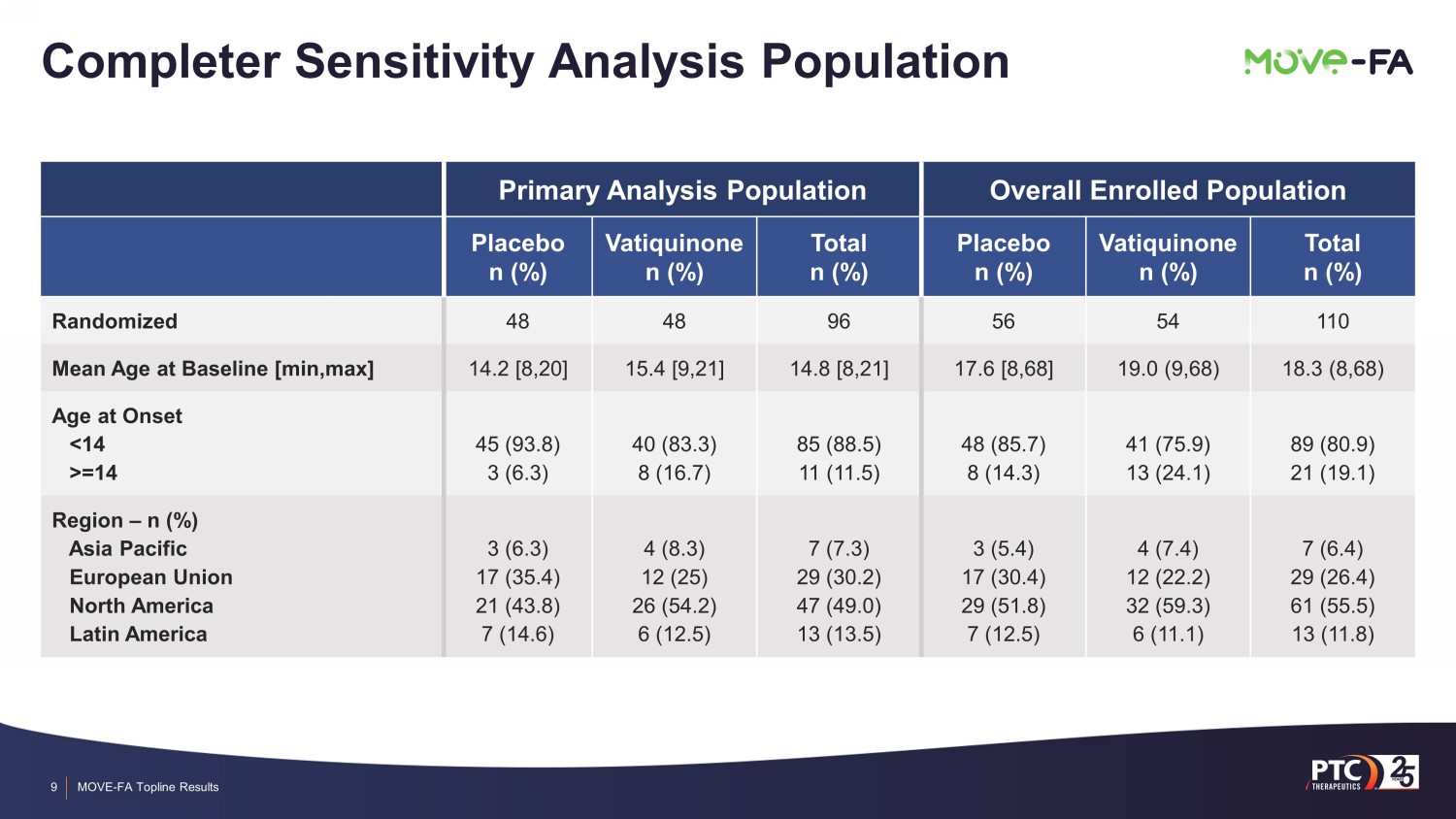 Pre - Specified Completers Sensitivity Analysis MOVE - FA Topline Results 8 As the study was conducted during the COVID - 19 pandemic, a pre - specified sensitivity analysis was included for subjects that completed the study protocol on assigned treatment The total number of subjects completing the study without treatment assignment disruption was 96 in the primary analysis population and 110 in the overall study population Excluded from this analysis were subjects that discontinued due to COVID - related issues, non - compliance, dose disruptions and withdrawal for other reasons