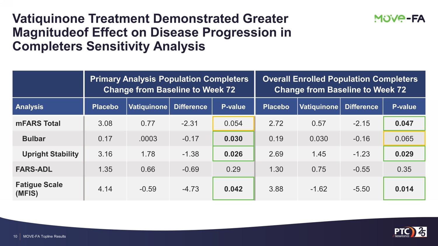 Completer Sensitivity Analysis Population MOVE - FA Topline Results 9 Primary Analysis Population Overall Enrolled Population Placebo n (%) Vatiquinone n (%) Total n (%) Placebo n (%) Vatiquinone n (%) Total n (%) Randomized 48 48 96 56 54 110 Mean Age at Baseline [min,max] 14.2 [8,20] 15.4 [9,21] 14.8 [8,21] 17.6 [8,68] 19.0 (9,68) 18.3 (8,68) Age at Onset <14 >=14 45 (93.8) 3 (6.3) 40 (83.3) 8 (16.7) 85 (88.5) 11 (11.5) 48 (85.7) 8 (14.3) 41 (75.9) 13 (24.1) 89 (80.9) 21 (19.1) Region – n (%) Asia Pacific European Union North America Latin America 3 (6.3) 17 (35.4) 21 (43.8) 7 (14.6) 4 (8.3) 12 (25) 26 (54.2) 6 (12.5) 7 (7.3) 29 (30.2) 47 (49.0) 13 (13.5) 3 (5.4) 17 (30.4) 29 (51.8) 7 (12.5) 4 (7.4) 12 (22.2) 32 (59.3) 6 (11.1) 7 (6.4) 29 (26.4) 61 (55.5) 13 (11.8)