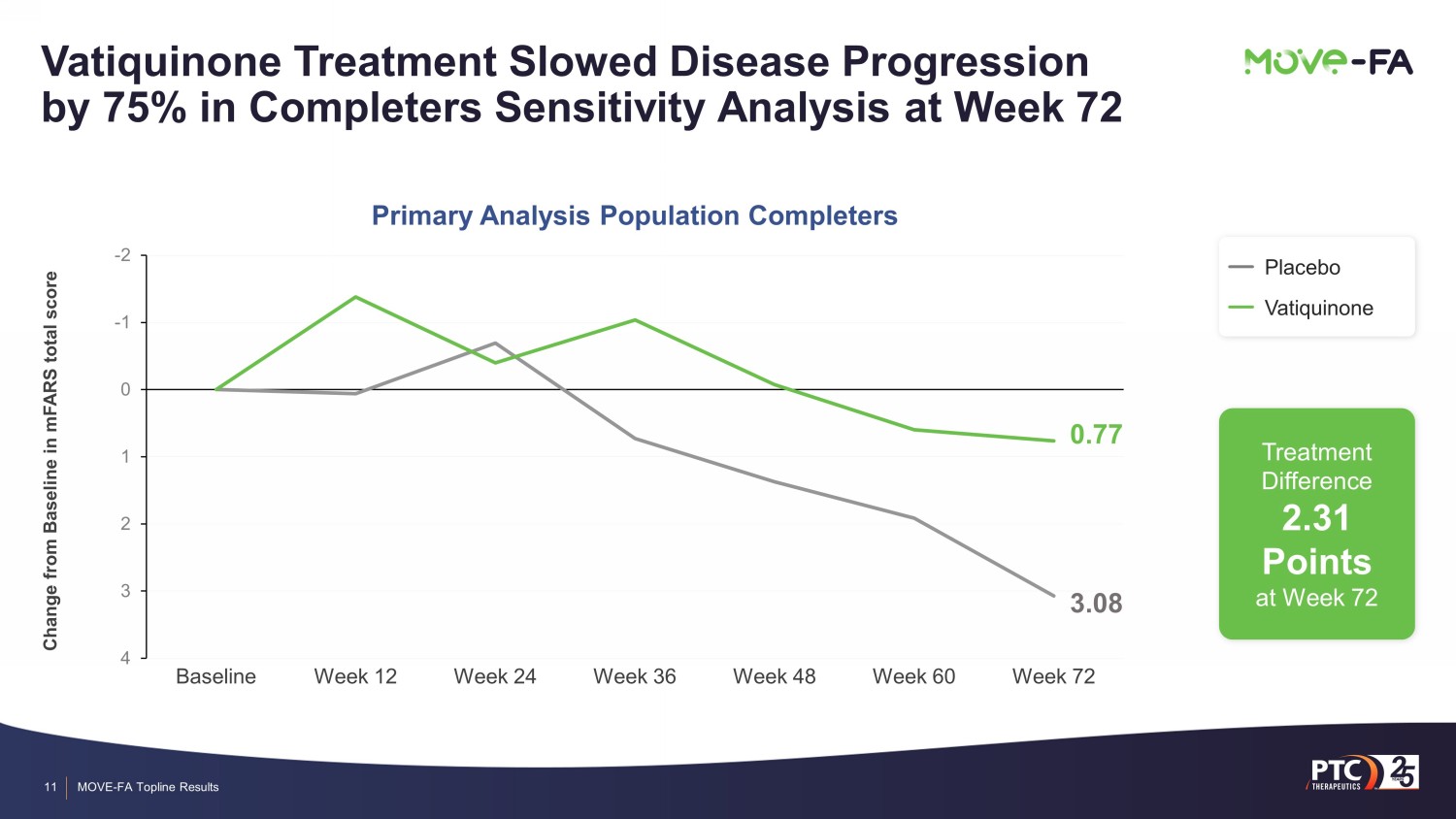 Vatiquinone Treatment Demonstrated Greater Magnitudeof Effect on Disease Progression in Completers Sensitivity Analysis MOVE - FA Topline Results 10 Primary Analysis Population Completers Change from Baseline to Week 72 Overall Enrolled Population Completers Change from Baseline to Week 72 Analysis Placebo Vatiquinone Difference P - value Placebo Vatiquinone Difference P - value mFARS Total 3.08 0.77 - 2.31 0.054 2.72 0.57 - 2.15 0.047 Bulbar 0.17 .0003 - 0.17 0.030 0.19 0.030 - 0.16 0.065 Upright Stability 3.16 1.78 - 1.38 0.026 2.69 1.45 - 1.23 0.029 FARS - ADL 1.35 0.66 - 0.69 0.29 1.30 0.75 - 0.55 0.35 Fatigue Scale (MFIS) 4.14 - 0.59 - 4.73 0.042 3.88 - 1.62 - 5.50 0.014