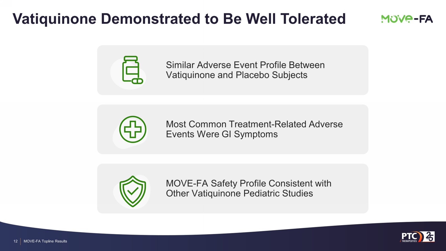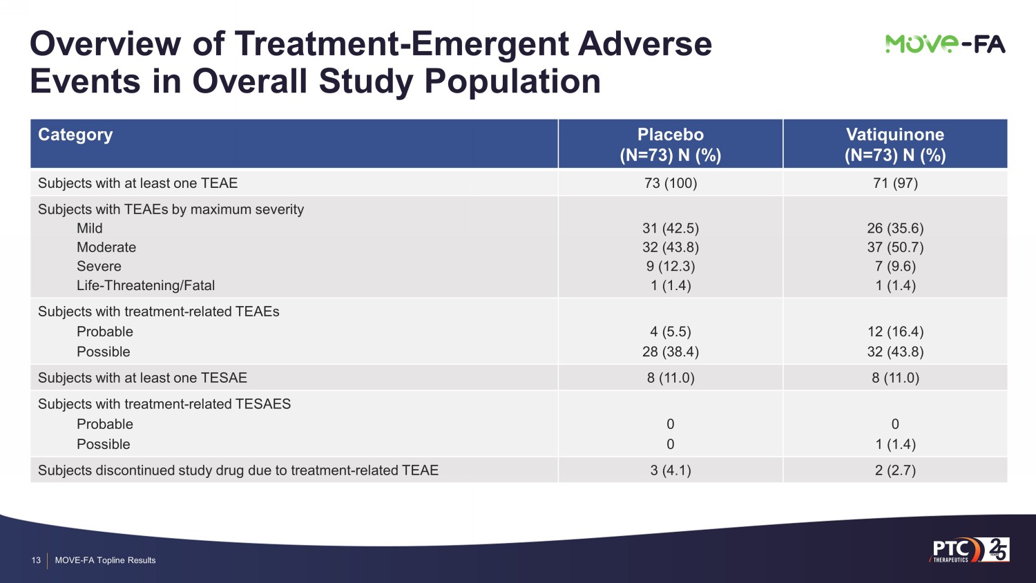 Vatiquinone Demonstrated to Be Well Tolerated MOVE - FA Topline Results 12 MOVE - FA Safety Profile Consistent with Other Vatiquinone Pediatric Studies Similar Adverse Event Profile Between Vatiquinone and Placebo Subjects Most Common Treatment - Related Adverse Events Were GI Symptoms