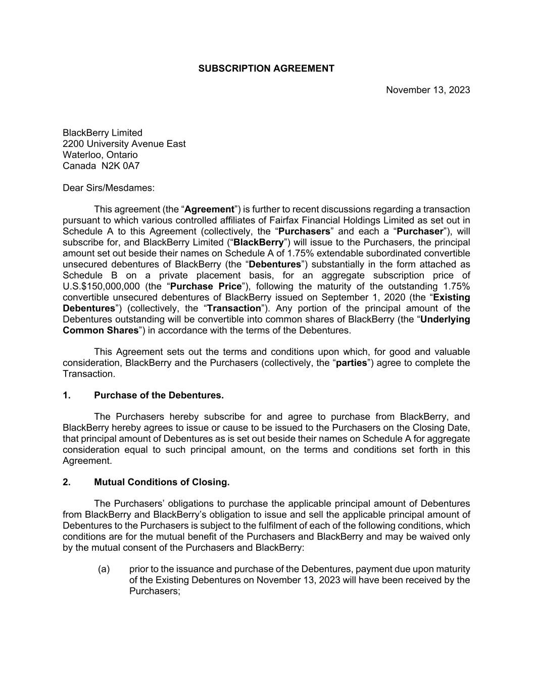SUBSCRIPTION AGREEMENT November 13, 2023 BlackBerry Limited 2200 University Avenue East Waterloo, Ontario Canada N2K 0A7 Dear Sirs/Mesdames: This agreement (the “Agreement”) is further to recent discussions regarding a transaction pursuant to which various controlled affiliates of Fairfax Financial Holdings Limited as set out in Schedule A to this Agreement (collectively, the “Purchasers” and each a “Purchaser”), will subscribe for, and BlackBerry Limited (“BlackBerry”) will issue to the Purchasers, the principal amount set out beside their names on Schedule A of 1.75% extendable subordinated convertible unsecured debentures of BlackBerry (the “Debentures”) substantially in the form attached as Schedule B on a private placement basis, for an aggregate subscription price of U.S.$150,000,000 (the “Purchase Price”), following the maturity of the outstanding 1.75% convertible unsecured debentures of BlackBerry issued on September 1, 2020 (the “Existing Debentures”) (collectively, the “Transaction”). Any portion of the principal amount of the Debentures outstanding will be convertible into common shares of BlackBerry (the “Underlying Common Shares”) in accordance with the terms of the Debentures. This Agreement sets out the terms and conditions upon which, for good and valuable consideration, BlackBerry and the Purchasers (collectively, the “parties”) agree to complete the Transaction. 1. Purchase of the Debentures. The Purchasers hereby subscribe for and agree to purchase from BlackBerry, and BlackBerry hereby agrees to issue or cause to be issued to the Purchasers on the Closing Date, that principal amount of Debentures as is set out beside their names on Schedule A for aggregate consideration equal to such principal amount, on the terms and conditions set forth in this Agreement. 2. Mutual Conditions of Closing. The Purchasers’ obligations to purchase the applicable principal amount of Debentures from BlackBerry and BlackBerry’s obligation to issue and sell the applicable principal amount of Debentures to the Purchasers is subject to the fulfilment of each of the following conditions, which conditions are for the mutual benefit of the Purchasers and BlackBerry and may be waived only by the mutual consent of the Purchasers and BlackBerry: (a) prior to the issuance and purchase of the Debentures, payment due upon maturity of the Existing Debentures on November 13, 2023 will have been received by the Purchasers;