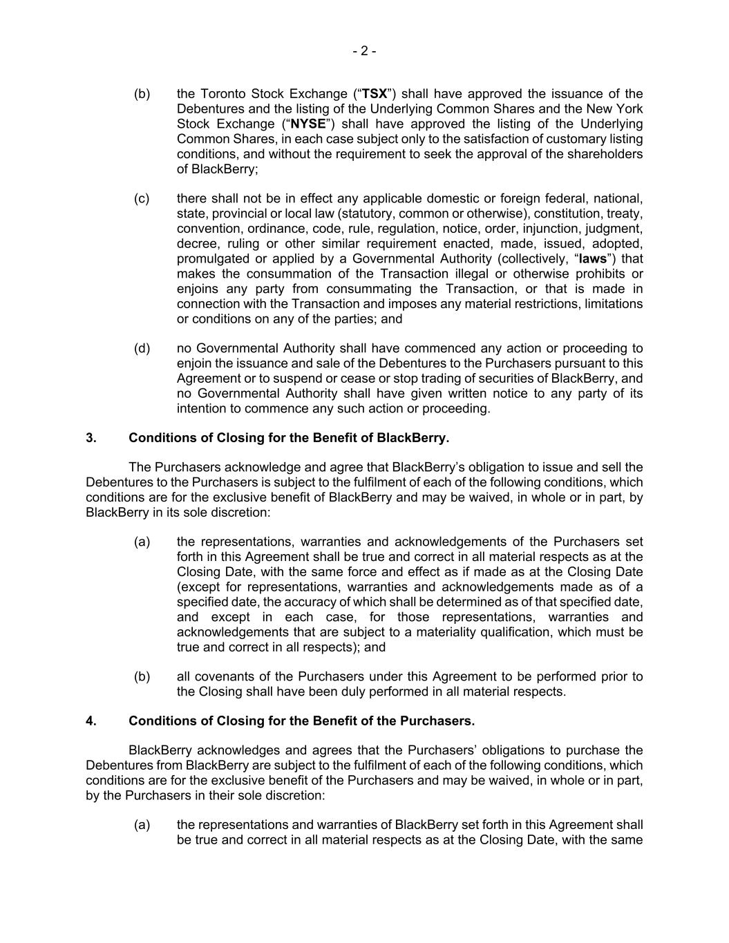 - 2 - (b) the Toronto Stock Exchange (“TSX”) shall have approved the issuance of the Debentures and the listing of the Underlying Common Shares and the New York Stock Exchange (“NYSE”) shall have approved the listing of the Underlying Common Shares, in each case subject only to the satisfaction of customary listing conditions, and without the requirement to seek the approval of the shareholders of BlackBerry; (c) there shall not be in effect any applicable domestic or foreign federal, national, state, provincial or local law (statutory, common or otherwise), constitution, treaty, convention, ordinance, code, rule, regulation, notice, order, injunction, judgment, decree, ruling or other similar requirement enacted, made, issued, adopted, promulgated or applied by a Governmental Authority (collectively, “laws”) that makes the consummation of the Transaction illegal or otherwise prohibits or enjoins any party from consummating the Transaction, or that is made in connection with the Transaction and imposes any material restrictions, limitations or conditions on any of the parties; and (d) no Governmental Authority shall have commenced any action or proceeding to enjoin the issuance and sale of the Debentures to the Purchasers pursuant to this Agreement or to suspend or cease or stop trading of securities of BlackBerry, and no Governmental Authority shall have given written notice to any party of its intention to commence any such action or proceeding. 3. Conditions of Closing for the Benefit of BlackBerry. The Purchasers acknowledge and agree that BlackBerry’s obligation to issue and sell the Debentures to the Purchasers is subject to the fulfilment of each of the following conditions, which conditions are for the exclusive benefit of BlackBerry and may be waived, in whole or in part, by BlackBerry in its sole discretion: (a) the representations, warranties and acknowledgements of the Purchasers set forth in this Agreement shall be true and correct in all material respects as at the Closing Date, with the same force and effect as if made as at the Closing Date (except for representations, warranties and acknowledgements made as of a specified date, the accuracy of which shall be determined as of that specified date, and except in each case, for those representations, warranties and acknowledgements that are subject to a materiality qualification, which must be true and correct in all respects); and (b) all covenants of the Purchasers under this Agreement to be performed prior to the Closing shall have been duly performed in all material respects. 4. Conditions of Closing for the Benefit of the Purchasers. BlackBerry acknowledges and agrees that the Purchasers’ obligations to purchase the Debentures from BlackBerry are subject to the fulfilment of each of the following conditions, which conditions are for the exclusive benefit of the Purchasers and may be waived, in whole or in part, by the Purchasers in their sole discretion: (a) the representations and warranties of BlackBerry set forth in this Agreement shall be true and correct in all material respects as at the Closing Date, with the same