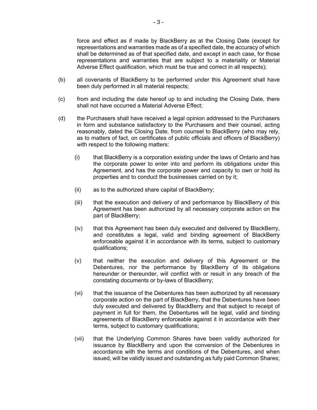 - 3 - force and effect as if made by BlackBerry as at the Closing Date (except for representations and warranties made as of a specified date, the accuracy of which shall be determined as of that specified date, and except in each case, for those representations and warranties that are subject to a materiality or Material Adverse Effect qualification, which must be true and correct in all respects); (b) all covenants of BlackBerry to be performed under this Agreement shall have been duly performed in all material respects; (c) from and including the date hereof up to and including the Closing Date, there shall not have occurred a Material Adverse Effect; (d) the Purchasers shall have received a legal opinion addressed to the Purchasers in form and substance satisfactory to the Purchasers and their counsel, acting reasonably, dated the Closing Date, from counsel to BlackBerry (who may rely, as to matters of fact, on certificates of public officials and officers of BlackBerry) with respect to the following matters: (i) that BlackBerry is a corporation existing under the laws of Ontario and has the corporate power to enter into and perform its obligations under this Agreement, and has the corporate power and capacity to own or hold its properties and to conduct the businesses carried on by it; (ii) as to the authorized share capital of BlackBerry; (iii) that the execution and delivery of and performance by BlackBerry of this Agreement has been authorized by all necessary corporate action on the part of BlackBerry; (iv) that this Agreement has been duly executed and delivered by BlackBerry, and constitutes a legal, valid and binding agreement of BlackBerry enforceable against it in accordance with its terms, subject to customary qualifications; (v) that neither the execution and delivery of this Agreement or the Debentures, nor the performance by BlackBerry of its obligations hereunder or thereunder, will conflict with or result in any breach of the constating documents or by-laws of BlackBerry; (vi) that the issuance of the Debentures has been authorized by all necessary corporate action on the part of BlackBerry, that the Debentures have been duly executed and delivered by BlackBerry and that subject to receipt of payment in full for them, the Debentures will be legal, valid and binding agreements of BlackBerry enforceable against it in accordance with their terms, subject to customary qualifications; (vii) that the Underlying Common Shares have been validly authorized for issuance by BlackBerry and upon the conversion of the Debentures in accordance with the terms and conditions of the Debentures, and when issued, will be validly issued and outstanding as fully paid Common Shares;