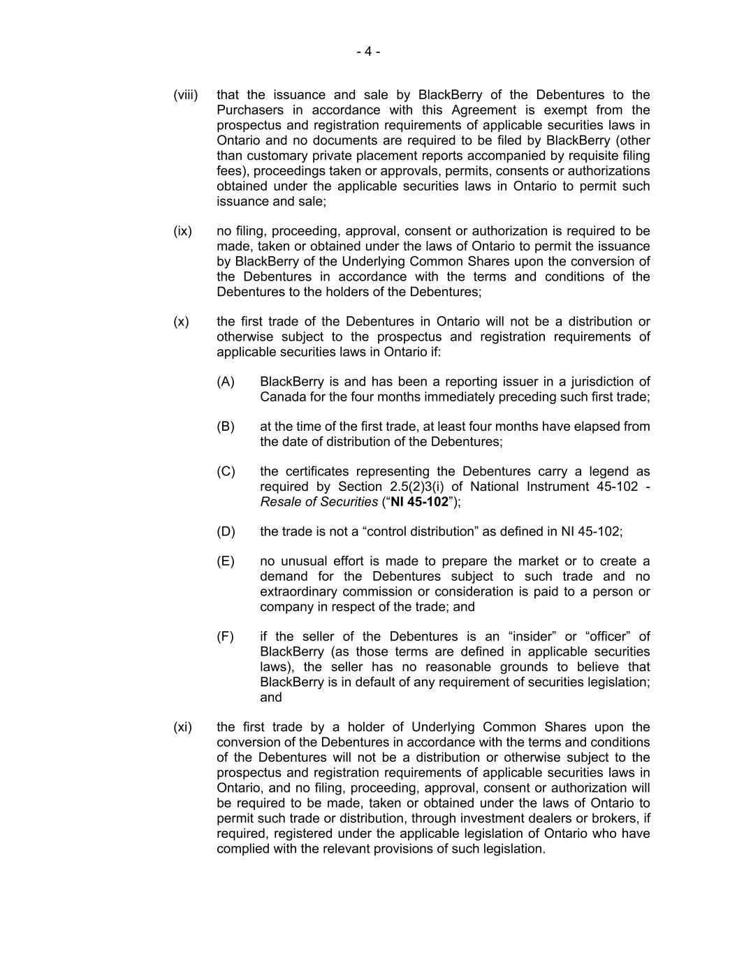 - 4 - (viii) that the issuance and sale by BlackBerry of the Debentures to the Purchasers in accordance with this Agreement is exempt from the prospectus and registration requirements of applicable securities laws in Ontario and no documents are required to be filed by BlackBerry (other than customary private placement reports accompanied by requisite filing fees), proceedings taken or approvals, permits, consents or authorizations obtained under the applicable securities laws in Ontario to permit such issuance and sale; (ix) no filing, proceeding, approval, consent or authorization is required to be made, taken or obtained under the laws of Ontario to permit the issuance by BlackBerry of the Underlying Common Shares upon the conversion of the Debentures in accordance with the terms and conditions of the Debentures to the holders of the Debentures; (x) the first trade of the Debentures in Ontario will not be a distribution or otherwise subject to the prospectus and registration requirements of applicable securities laws in Ontario if: (A) BlackBerry is and has been a reporting issuer in a jurisdiction of Canada for the four months immediately preceding such first trade; (B) at the time of the first trade, at least four months have elapsed from the date of distribution of the Debentures; (C) the certificates representing the Debentures carry a legend as required by Section 2.5(2)3(i) of National Instrument 45-102 - Resale of Securities (“NI 45-102”); (D) the trade is not a “control distribution” as defined in NI 45-102; (E) no unusual effort is made to prepare the market or to create a demand for the Debentures subject to such trade and no extraordinary commission or consideration is paid to a person or company in respect of the trade; and (F) if the seller of the Debentures is an “insider” or “officer” of BlackBerry (as those terms are defined in applicable securities laws), the seller has no reasonable grounds to believe that BlackBerry is in default of any requirement of securities legislation; and (xi) the first trade by a holder of Underlying Common Shares upon the conversion of the Debentures in accordance with the terms and conditions of the Debentures will not be a distribution or otherwise subject to the prospectus and registration requirements of applicable securities laws in Ontario, and no filing, proceeding, approval, consent or authorization will be required to be made, taken or obtained under the laws of Ontario to permit such trade or distribution, through investment dealers or brokers, if required, registered under the applicable legislation of Ontario who have complied with the relevant provisions of such legislation.