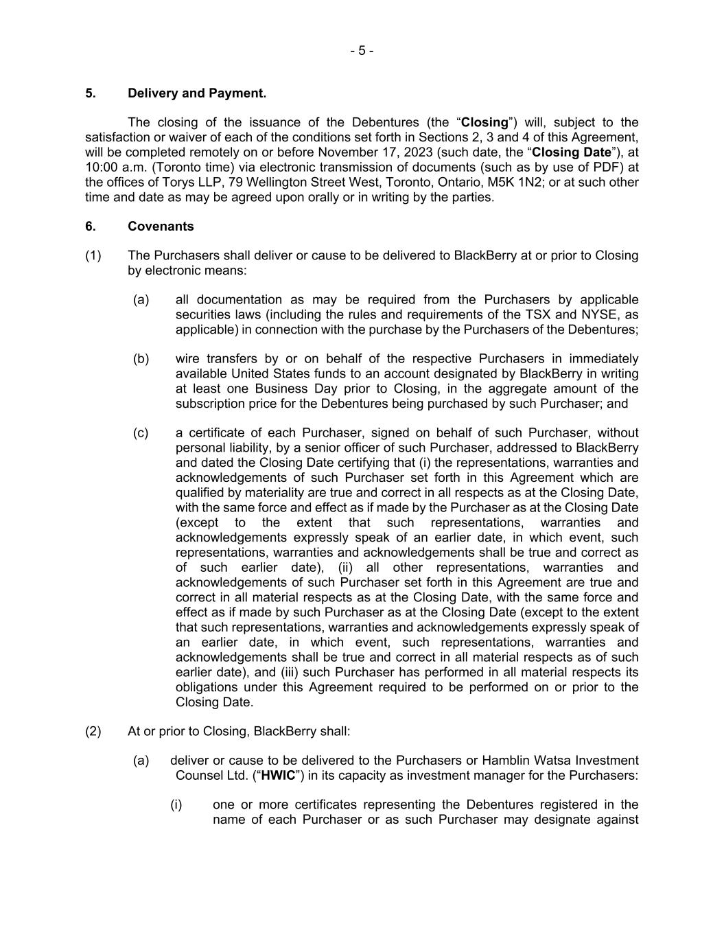 - 5 - 5. Delivery and Payment. The closing of the issuance of the Debentures (the “Closing”) will, subject to the satisfaction or waiver of each of the conditions set forth in Sections 2, 3 and 4 of this Agreement, will be completed remotely on or before November 17, 2023 (such date, the “Closing Date”), at 10:00 a.m. (Toronto time) via electronic transmission of documents (such as by use of PDF) at the offices of Torys LLP, 79 Wellington Street West, Toronto, Ontario, M5K 1N2; or at such other time and date as may be agreed upon orally or in writing by the parties. 6. Covenants (1) The Purchasers shall deliver or cause to be delivered to BlackBerry at or prior to Closing by electronic means: (a) all documentation as may be required from the Purchasers by applicable securities laws (including the rules and requirements of the TSX and NYSE, as applicable) in connection with the purchase by the Purchasers of the Debentures; (b) wire transfers by or on behalf of the respective Purchasers in immediately available United States funds to an account designated by BlackBerry in writing at least one Business Day prior to Closing, in the aggregate amount of the subscription price for the Debentures being purchased by such Purchaser; and (c) a certificate of each Purchaser, signed on behalf of such Purchaser, without personal liability, by a senior officer of such Purchaser, addressed to BlackBerry and dated the Closing Date certifying that (i) the representations, warranties and acknowledgements of such Purchaser set forth in this Agreement which are qualified by materiality are true and correct in all respects as at the Closing Date, with the same force and effect as if made by the Purchaser as at the Closing Date (except to the extent that such representations, warranties and acknowledgements expressly speak of an earlier date, in which event, such representations, warranties and acknowledgements shall be true and correct as of such earlier date), (ii) all other representations, warranties and acknowledgements of such Purchaser set forth in this Agreement are true and correct in all material respects as at the Closing Date, with the same force and effect as if made by such Purchaser as at the Closing Date (except to the extent that such representations, warranties and acknowledgements expressly speak of an earlier date, in which event, such representations, warranties and acknowledgements shall be true and correct in all material respects as of such earlier date), and (iii) such Purchaser has performed in all material respects its obligations under this Agreement required to be performed on or prior to the Closing Date. (2) At or prior to Closing, BlackBerry shall: (a) deliver or cause to be delivered to the Purchasers or Hamblin Watsa Investment Counsel Ltd. (“HWIC”) in its capacity as investment manager for the Purchasers: (i) one or more certificates representing the Debentures registered in the name of each Purchaser or as such Purchaser may designate against