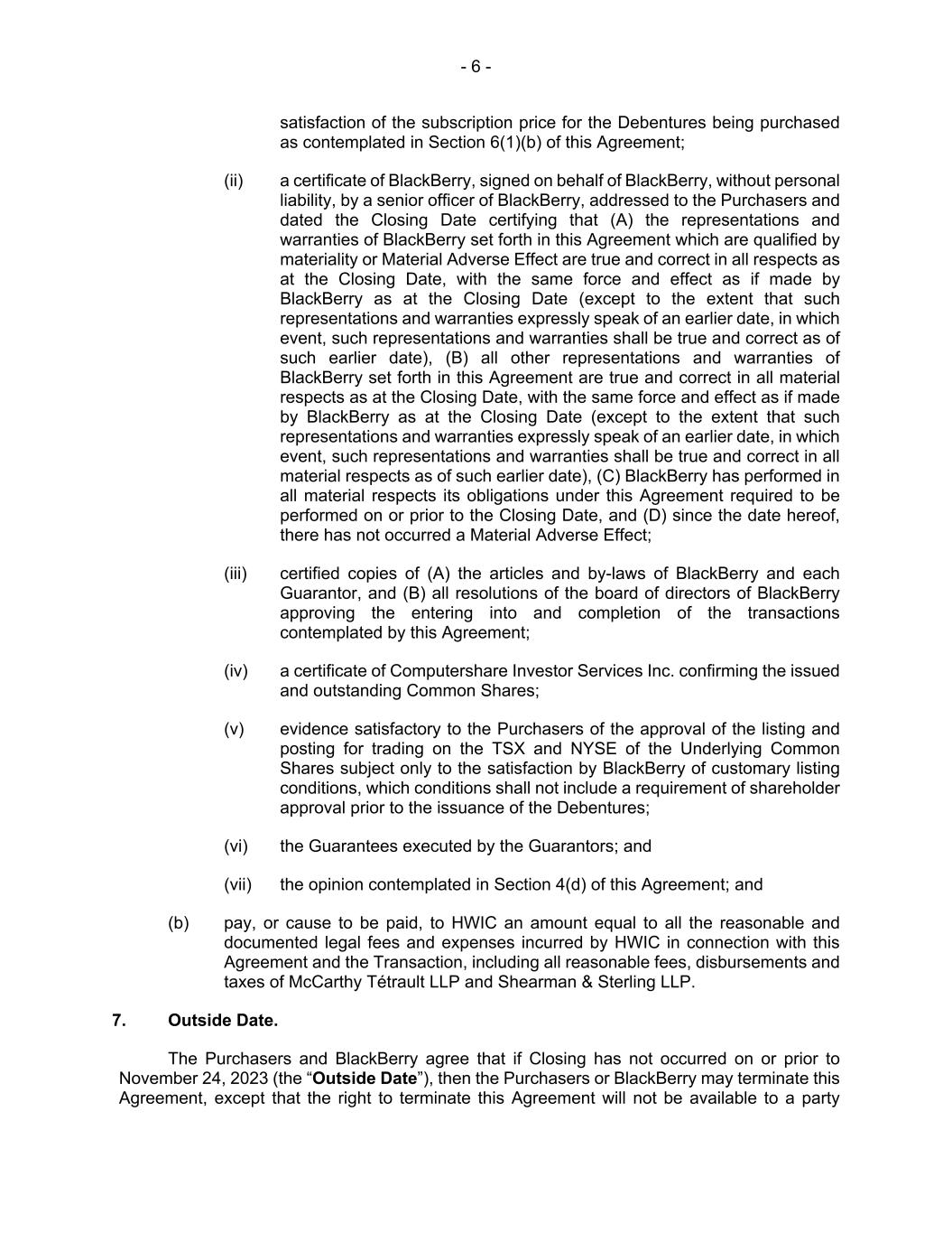 - 6 - satisfaction of the subscription price for the Debentures being purchased as contemplated in Section 6(1)(b) of this Agreement; (ii) a certificate of BlackBerry, signed on behalf of BlackBerry, without personal liability, by a senior officer of BlackBerry, addressed to the Purchasers and dated the Closing Date certifying that (A) the representations and warranties of BlackBerry set forth in this Agreement which are qualified by materiality or Material Adverse Effect are true and correct in all respects as at the Closing Date, with the same force and effect as if made by BlackBerry as at the Closing Date (except to the extent that such representations and warranties expressly speak of an earlier date, in which event, such representations and warranties shall be true and correct as of such earlier date), (B) all other representations and warranties of BlackBerry set forth in this Agreement are true and correct in all material respects as at the Closing Date, with the same force and effect as if made by BlackBerry as at the Closing Date (except to the extent that such representations and warranties expressly speak of an earlier date, in which event, such representations and warranties shall be true and correct in all material respects as of such earlier date), (C) BlackBerry has performed in all material respects its obligations under this Agreement required to be performed on or prior to the Closing Date, and (D) since the date hereof, there has not occurred a Material Adverse Effect; (iii) certified copies of (A) the articles and by-laws of BlackBerry and each Guarantor, and (B) all resolutions of the board of directors of BlackBerry approving the entering into and completion of the transactions contemplated by this Agreement; (iv) a certificate of Computershare Investor Services Inc. confirming the issued and outstanding Common Shares; (v) evidence satisfactory to the Purchasers of the approval of the listing and posting for trading on the TSX and NYSE of the Underlying Common Shares subject only to the satisfaction by BlackBerry of customary listing conditions, which conditions shall not include a requirement of shareholder approval prior to the issuance of the Debentures; (vi) the Guarantees executed by the Guarantors; and (vii) the opinion contemplated in Section 4(d) of this Agreement; and (b) pay, or cause to be paid, to HWIC an amount equal to all the reasonable and documented legal fees and expenses incurred by HWIC in connection with this Agreement and the Transaction, including all reasonable fees, disbursements and taxes of McCarthy Tétrault LLP and Shearman & Sterling LLP. 7. Outside Date. The Purchasers and BlackBerry agree that if Closing has not occurred on or prior to November 24, 2023 (the “Outside Date”), then the Purchasers or BlackBerry may terminate this Agreement, except that the right to terminate this Agreement will not be available to a party