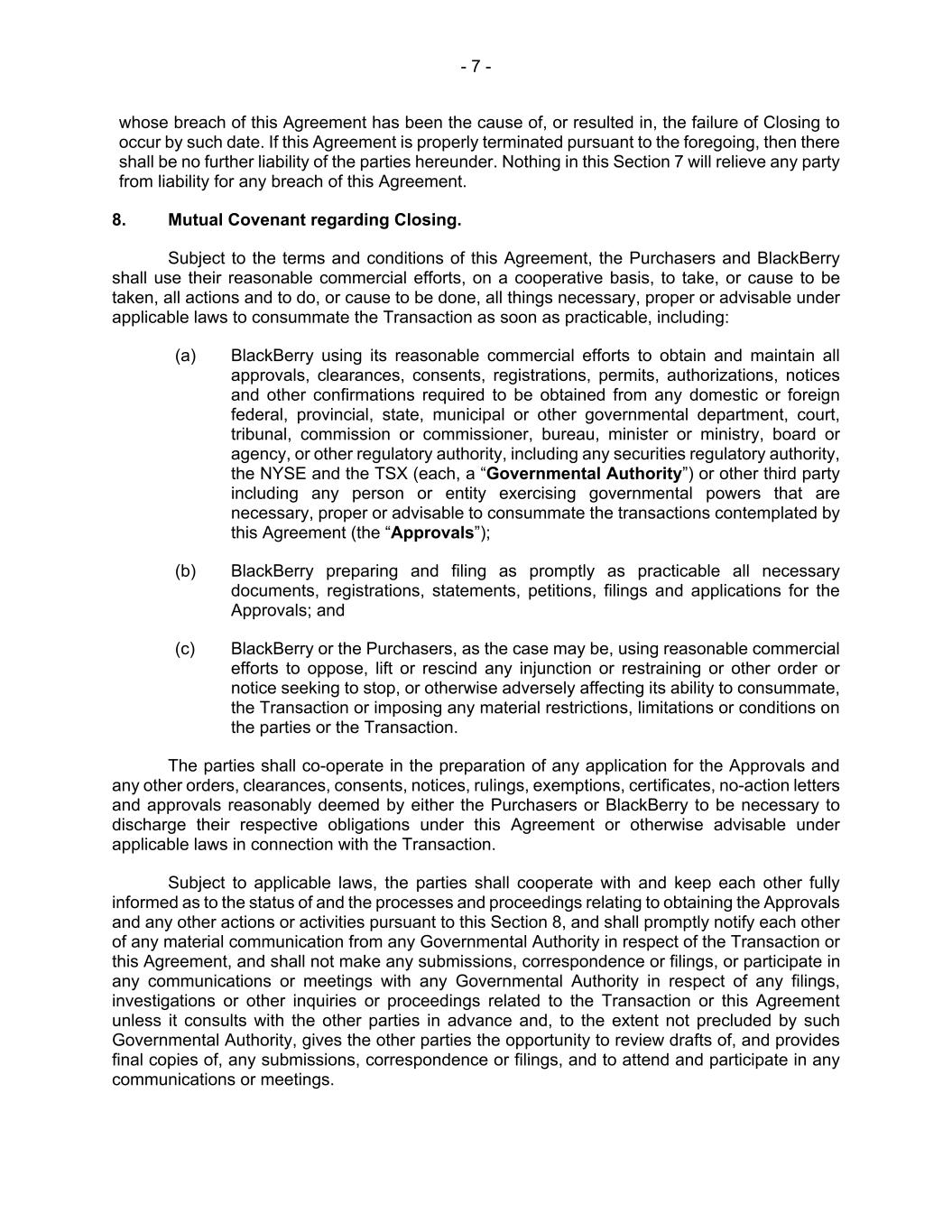 - 7 - whose breach of this Agreement has been the cause of, or resulted in, the failure of Closing to occur by such date. If this Agreement is properly terminated pursuant to the foregoing, then there shall be no further liability of the parties hereunder. Nothing in this Section 7 will relieve any party from liability for any breach of this Agreement. 8. Mutual Covenant regarding Closing. Subject to the terms and conditions of this Agreement, the Purchasers and BlackBerry shall use their reasonable commercial efforts, on a cooperative basis, to take, or cause to be taken, all actions and to do, or cause to be done, all things necessary, proper or advisable under applicable laws to consummate the Transaction as soon as practicable, including: (a) BlackBerry using its reasonable commercial efforts to obtain and maintain all approvals, clearances, consents, registrations, permits, authorizations, notices and other confirmations required to be obtained from any domestic or foreign federal, provincial, state, municipal or other governmental department, court, tribunal, commission or commissioner, bureau, minister or ministry, board or agency, or other regulatory authority, including any securities regulatory authority, the NYSE and the TSX (each, a “Governmental Authority”) or other third party including any person or entity exercising governmental powers that are necessary, proper or advisable to consummate the transactions contemplated by this Agreement (the “Approvals”); (b) BlackBerry preparing and filing as promptly as practicable all necessary documents, registrations, statements, petitions, filings and applications for the Approvals; and (c) BlackBerry or the Purchasers, as the case may be, using reasonable commercial efforts to oppose, lift or rescind any injunction or restraining or other order or notice seeking to stop, or otherwise adversely affecting its ability to consummate, the Transaction or imposing any material restrictions, limitations or conditions on the parties or the Transaction. The parties shall co-operate in the preparation of any application for the Approvals and any other orders, clearances, consents, notices, rulings, exemptions, certificates, no-action letters and approvals reasonably deemed by either the Purchasers or BlackBerry to be necessary to discharge their respective obligations under this Agreement or otherwise advisable under applicable laws in connection with the Transaction. Subject to applicable laws, the parties shall cooperate with and keep each other fully informed as to the status of and the processes and proceedings relating to obtaining the Approvals and any other actions or activities pursuant to this Section 8, and shall promptly notify each other of any material communication from any Governmental Authority in respect of the Transaction or this Agreement, and shall not make any submissions, correspondence or filings, or participate in any communications or meetings with any Governmental Authority in respect of any filings, investigations or other inquiries or proceedings related to the Transaction or this Agreement unless it consults with the other parties in advance and, to the extent not precluded by such Governmental Authority, gives the other parties the opportunity to review drafts of, and provides final copies of, any submissions, correspondence or filings, and to attend and participate in any communications or meetings.