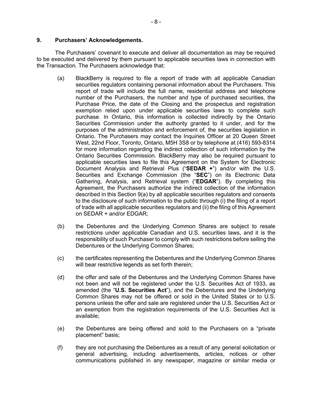 - 8 - 9. Purchasers’ Acknowledgements. The Purchasers’ covenant to execute and deliver all documentation as may be required to be executed and delivered by them pursuant to applicable securities laws in connection with the Transaction. The Purchasers acknowledge that: (a) BlackBerry is required to file a report of trade with all applicable Canadian securities regulators containing personal information about the Purchasers. This report of trade will include the full name, residential address and telephone number of the Purchasers, the number and type of purchased securities, the Purchase Price, the date of the Closing and the prospectus and registration exemption relied upon under applicable securities laws to complete such purchase. In Ontario, this information is collected indirectly by the Ontario Securities Commission under the authority granted to it under, and for the purposes of the administration and enforcement of, the securities legislation in Ontario. The Purchasers may contact the Inquiries Officer at 20 Queen Street West, 22nd Floor, Toronto, Ontario, M5H 3S8 or by telephone at (416) 593-8314 for more information regarding the indirect collection of such information by the Ontario Securities Commission. BlackBerry may also be required pursuant to applicable securities laws to file this Agreement on the System for Electronic Document Analysis and Retrieval Plus (“SEDAR +”) and/or with the U.S. Securities and Exchange Commission (the “SEC”) on its Electronic Data Gathering, Analysis, and Retrieval system (“EDGAR”). By completing this Agreement, the Purchasers authorize the indirect collection of the information described in this Section 9(a) by all applicable securities regulators and consents to the disclosure of such information to the public through (i) the filing of a report of trade with all applicable securities regulators and (ii) the filing of this Agreement on SEDAR + and/or EDGAR; (b) the Debentures and the Underlying Common Shares are subject to resale restrictions under applicable Canadian and U.S. securities laws, and it is the responsibility of such Purchaser to comply with such restrictions before selling the Debentures or the Underlying Common Shares; (c) the certificates representing the Debentures and the Underlying Common Shares will bear restrictive legends as set forth therein; (d) the offer and sale of the Debentures and the Underlying Common Shares have not been and will not be registered under the U.S. Securities Act of 1933, as amended (the “U.S. Securities Act”), and the Debentures and the Underlying Common Shares may not be offered or sold in the United States or to U.S. persons unless the offer and sale are registered under the U.S. Securities Act or an exemption from the registration requirements of the U.S. Securities Act is available; (e) the Debentures are being offered and sold to the Purchasers on a “private placement” basis; (f) they are not purchasing the Debentures as a result of any general solicitation or general advertising, including advertisements, articles, notices or other communications published in any newspaper, magazine or similar media or