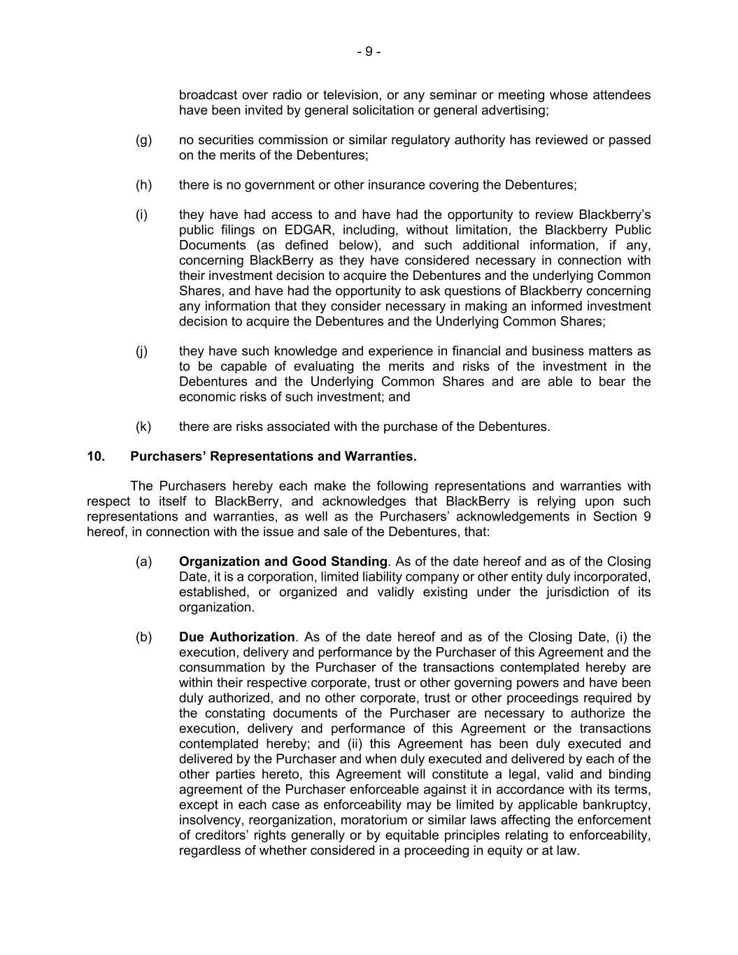 - 9 - broadcast over radio or television, or any seminar or meeting whose attendees have been invited by general solicitation or general advertising; (g) no securities commission or similar regulatory authority has reviewed or passed on the merits of the Debentures; (h) there is no government or other insurance covering the Debentures; (i) they have had access to and have had the opportunity to review Blackberry’s public filings on EDGAR, including, without limitation, the Blackberry Public Documents (as defined below), and such additional information, if any, concerning BlackBerry as they have considered necessary in connection with their investment decision to acquire the Debentures and the underlying Common Shares, and have had the opportunity to ask questions of Blackberry concerning any information that they consider necessary in making an informed investment decision to acquire the Debentures and the Underlying Common Shares; (j) they have such knowledge and experience in financial and business matters as to be capable of evaluating the merits and risks of the investment in the Debentures and the Underlying Common Shares and are able to bear the economic risks of such investment; and (k) there are risks associated with the purchase of the Debentures. 10. Purchasers’ Representations and Warranties. The Purchasers hereby each make the following representations and warranties with respect to itself to BlackBerry, and acknowledges that BlackBerry is relying upon such representations and warranties, as well as the Purchasers’ acknowledgements in Section 9 hereof, in connection with the issue and sale of the Debentures, that: (a) Organization and Good Standing. As of the date hereof and as of the Closing Date, it is a corporation, limited liability company or other entity duly incorporated, established, or organized and validly existing under the jurisdiction of its organization. (b) Due Authorization. As of the date hereof and as of the Closing Date, (i) the execution, delivery and performance by the Purchaser of this Agreement and the consummation by the Purchaser of the transactions contemplated hereby are within their respective corporate, trust or other governing powers and have been duly authorized, and no other corporate, trust or other proceedings required by the constating documents of the Purchaser are necessary to authorize the execution, delivery and performance of this Agreement or the transactions contemplated hereby; and (ii) this Agreement has been duly executed and delivered by the Purchaser and when duly executed and delivered by each of the other parties hereto, this Agreement will constitute a legal, valid and binding agreement of the Purchaser enforceable against it in accordance with its terms, except in each case as enforceability may be limited by applicable bankruptcy, insolvency, reorganization, moratorium or similar laws affecting the enforcement of creditors’ rights generally or by equitable principles relating to enforceability, regardless of whether considered in a proceeding in equity or at law.