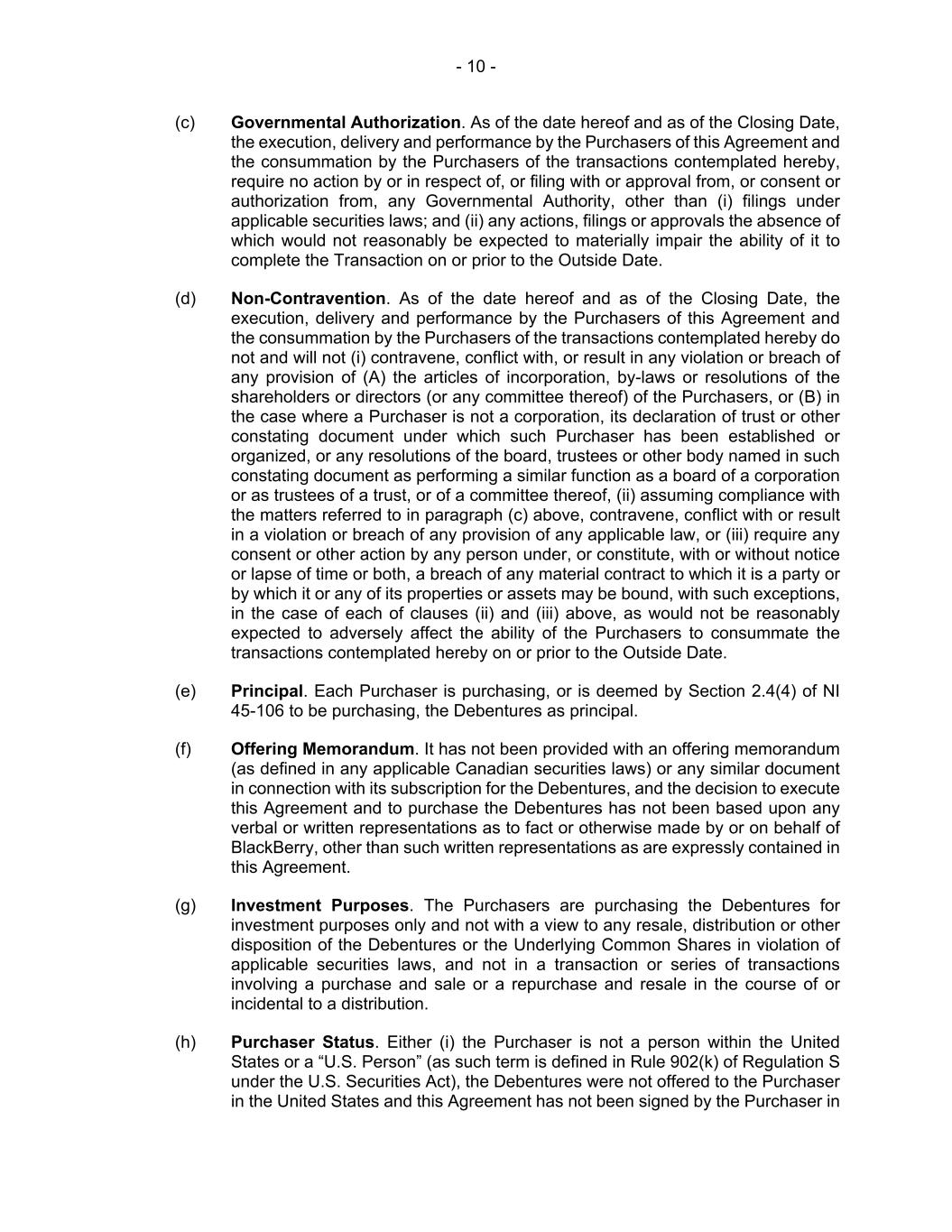 - 10 - (c) Governmental Authorization. As of the date hereof and as of the Closing Date, the execution, delivery and performance by the Purchasers of this Agreement and the consummation by the Purchasers of the transactions contemplated hereby, require no action by or in respect of, or filing with or approval from, or consent or authorization from, any Governmental Authority, other than (i) filings under applicable securities laws; and (ii) any actions, filings or approvals the absence of which would not reasonably be expected to materially impair the ability of it to complete the Transaction on or prior to the Outside Date. (d) Non-Contravention. As of the date hereof and as of the Closing Date, the execution, delivery and performance by the Purchasers of this Agreement and the consummation by the Purchasers of the transactions contemplated hereby do not and will not (i) contravene, conflict with, or result in any violation or breach of any provision of (A) the articles of incorporation, by-laws or resolutions of the shareholders or directors (or any committee thereof) of the Purchasers, or (B) in the case where a Purchaser is not a corporation, its declaration of trust or other constating document under which such Purchaser has been established or organized, or any resolutions of the board, trustees or other body named in such constating document as performing a similar function as a board of a corporation or as trustees of a trust, or of a committee thereof, (ii) assuming compliance with the matters referred to in paragraph (c) above, contravene, conflict with or result in a violation or breach of any provision of any applicable law, or (iii) require any consent or other action by any person under, or constitute, with or without notice or lapse of time or both, a breach of any material contract to which it is a party or by which it or any of its properties or assets may be bound, with such exceptions, in the case of each of clauses (ii) and (iii) above, as would not be reasonably expected to adversely affect the ability of the Purchasers to consummate the transactions contemplated hereby on or prior to the Outside Date. (e) Principal. Each Purchaser is purchasing, or is deemed by Section 2.4(4) of NI 45-106 to be purchasing, the Debentures as principal. (f) Offering Memorandum. It has not been provided with an offering memorandum (as defined in any applicable Canadian securities laws) or any similar document in connection with its subscription for the Debentures, and the decision to execute this Agreement and to purchase the Debentures has not been based upon any verbal or written representations as to fact or otherwise made by or on behalf of BlackBerry, other than such written representations as are expressly contained in this Agreement. (g) Investment Purposes. The Purchasers are purchasing the Debentures for investment purposes only and not with a view to any resale, distribution or other disposition of the Debentures or the Underlying Common Shares in violation of applicable securities laws, and not in a transaction or series of transactions involving a purchase and sale or a repurchase and resale in the course of or incidental to a distribution. (h) Purchaser Status. Either (i) the Purchaser is not a person within the United States or a “U.S. Person” (as such term is defined in Rule 902(k) of Regulation S under the U.S. Securities Act), the Debentures were not offered to the Purchaser in the United States and this Agreement has not been signed by the Purchaser in