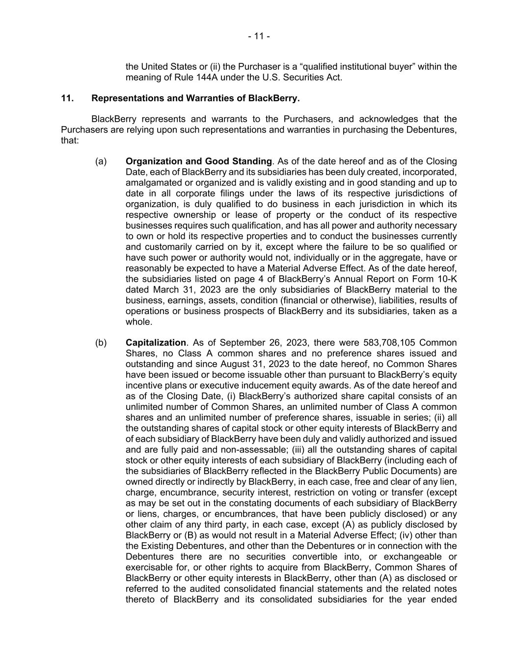 - 11 - the United States or (ii) the Purchaser is a “qualified institutional buyer” within the meaning of Rule 144A under the U.S. Securities Act. 11. Representations and Warranties of BlackBerry. BlackBerry represents and warrants to the Purchasers, and acknowledges that the Purchasers are relying upon such representations and warranties in purchasing the Debentures, that: (a) Organization and Good Standing. As of the date hereof and as of the Closing Date, each of BlackBerry and its subsidiaries has been duly created, incorporated, amalgamated or organized and is validly existing and in good standing and up to date in all corporate filings under the laws of its respective jurisdictions of organization, is duly qualified to do business in each jurisdiction in which its respective ownership or lease of property or the conduct of its respective businesses requires such qualification, and has all power and authority necessary to own or hold its respective properties and to conduct the businesses currently and customarily carried on by it, except where the failure to be so qualified or have such power or authority would not, individually or in the aggregate, have or reasonably be expected to have a Material Adverse Effect. As of the date hereof, the subsidiaries listed on page 4 of BlackBerry’s Annual Report on Form 10-K dated March 31, 2023 are the only subsidiaries of BlackBerry material to the business, earnings, assets, condition (financial or otherwise), liabilities, results of operations or business prospects of BlackBerry and its subsidiaries, taken as a whole. (b) Capitalization. As of September 26, 2023, there were 583,708,105 Common Shares, no Class A common shares and no preference shares issued and outstanding and since August 31, 2023 to the date hereof, no Common Shares have been issued or become issuable other than pursuant to BlackBerry’s equity incentive plans or executive inducement equity awards. As of the date hereof and as of the Closing Date, (i) BlackBerry’s authorized share capital consists of an unlimited number of Common Shares, an unlimited number of Class A common shares and an unlimited number of preference shares, issuable in series; (ii) all the outstanding shares of capital stock or other equity interests of BlackBerry and of each subsidiary of BlackBerry have been duly and validly authorized and issued and are fully paid and non-assessable; (iii) all the outstanding shares of capital stock or other equity interests of each subsidiary of BlackBerry (including each of the subsidiaries of BlackBerry reflected in the BlackBerry Public Documents) are owned directly or indirectly by BlackBerry, in each case, free and clear of any lien, charge, encumbrance, security interest, restriction on voting or transfer (except as may be set out in the constating documents of each subsidiary of BlackBerry or liens, charges, or encumbrances, that have been publicly disclosed) or any other claim of any third party, in each case, except (A) as publicly disclosed by BlackBerry or (B) as would not result in a Material Adverse Effect; (iv) other than the Existing Debentures, and other than the Debentures or in connection with the Debentures there are no securities convertible into, or exchangeable or exercisable for, or other rights to acquire from BlackBerry, Common Shares of BlackBerry or other equity interests in BlackBerry, other than (A) as disclosed or referred to the audited consolidated financial statements and the related notes thereto of BlackBerry and its consolidated subsidiaries for the year ended