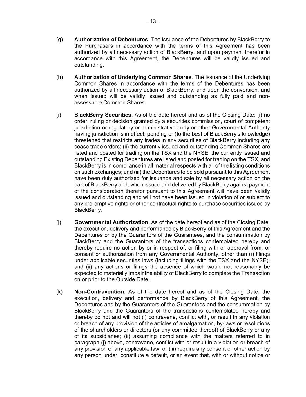 - 13 - (g) Authorization of Debentures. The issuance of the Debentures by BlackBerry to the Purchasers in accordance with the terms of this Agreement has been authorized by all necessary action of BlackBerry, and upon payment therefor in accordance with this Agreement, the Debentures will be validly issued and outstanding. (h) Authorization of Underlying Common Shares. The issuance of the Underlying Common Shares in accordance with the terms of the Debentures has been authorized by all necessary action of BlackBerry, and upon the conversion, and when issued will be validly issued and outstanding as fully paid and non- assessable Common Shares. (i) BlackBerry Securities. As of the date hereof and as of the Closing Date: (i) no order, ruling or decision granted by a securities commission, court of competent jurisdiction or regulatory or administrative body or other Governmental Authority having jurisdiction is in effect, pending or (to the best of BlackBerry’s knowledge) threatened that restricts any trades in any securities of BlackBerry including any cease trade orders; (ii) the currently issued and outstanding Common Shares are listed and posted for trading on the TSX and the NYSE, the currently issued and outstanding Existing Debentures are listed and posted for trading on the TSX, and BlackBerry is in compliance in all material respects with all of the listing conditions on such exchanges; and (iii) the Debentures to be sold pursuant to this Agreement have been duly authorized for issuance and sale by all necessary action on the part of BlackBerry and, when issued and delivered by BlackBerry against payment of the consideration therefor pursuant to this Agreement will have been validly issued and outstanding and will not have been issued in violation of or subject to any pre-emptive rights or other contractual rights to purchase securities issued by BlackBerry. (j) Governmental Authorization. As of the date hereof and as of the Closing Date, the execution, delivery and performance by BlackBerry of this Agreement and the Debentures or by the Guarantors of the Guarantees, and the consummation by BlackBerry and the Guarantors of the transactions contemplated hereby and thereby require no action by or in respect of, or filing with or approval from, or consent or authorization from any Governmental Authority, other than (i) filings under applicable securities laws (including filings with the TSX and the NYSE); and (ii) any actions or filings the absence of which would not reasonably be expected to materially impair the ability of BlackBerry to complete the Transaction on or prior to the Outside Date. (k) Non-Contravention. As of the date hereof and as of the Closing Date, the execution, delivery and performance by BlackBerry of this Agreement, the Debentures and by the Guarantors of the Guarantees and the consummation by BlackBerry and the Guarantors of the transactions contemplated hereby and thereby do not and will not (i) contravene, conflict with, or result in any violation or breach of any provision of the articles of amalgamation, by-laws or resolutions of the shareholders or directors (or any committee thereof) of BlackBerry or any of its subsidiaries; (ii) assuming compliance with the matters referred to in paragraph (j) above, contravene, conflict with or result in a violation or breach of any provision of any applicable law; or (iii) require any consent or other action by any person under, constitute a default, or an event that, with or without notice or