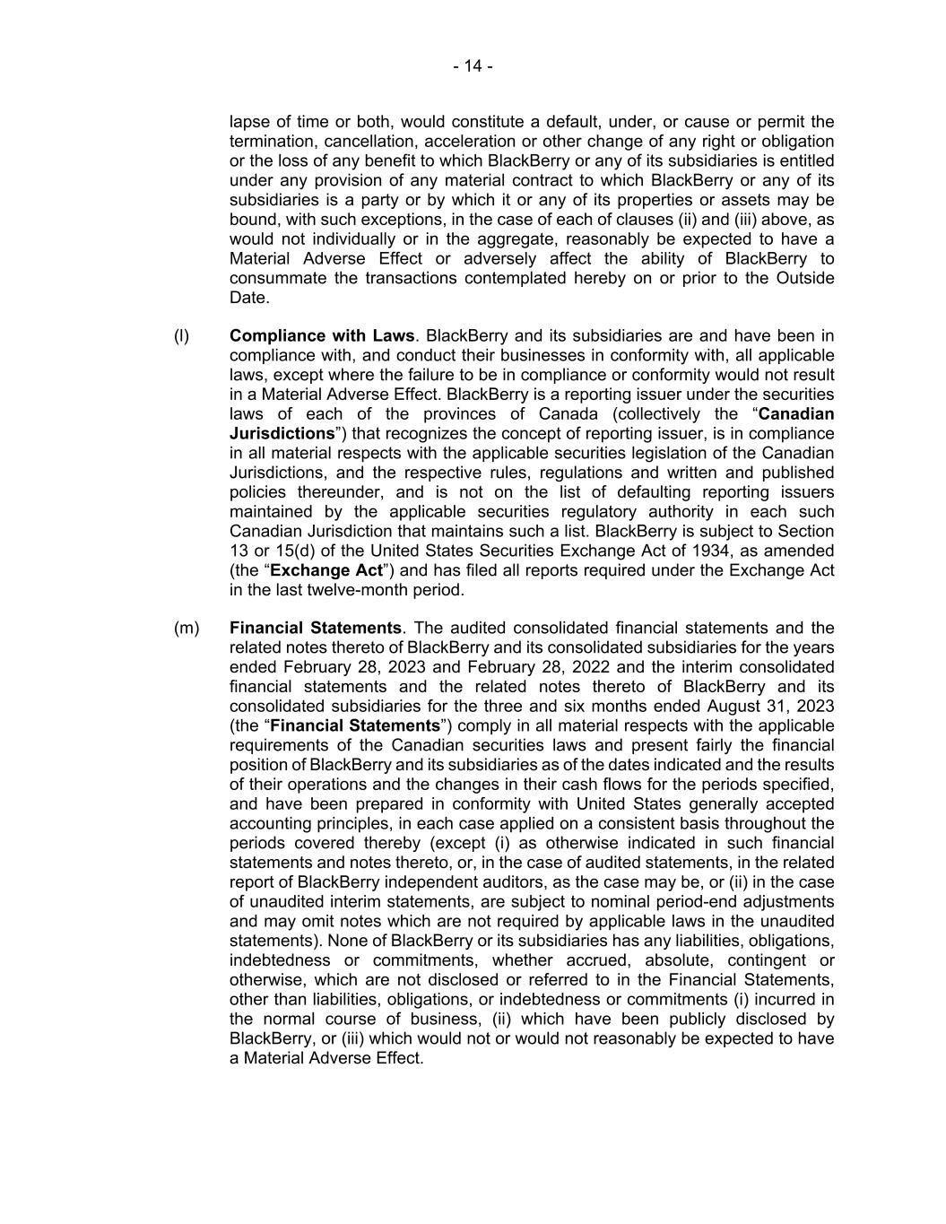 - 14 - lapse of time or both, would constitute a default, under, or cause or permit the termination, cancellation, acceleration or other change of any right or obligation or the loss of any benefit to which BlackBerry or any of its subsidiaries is entitled under any provision of any material contract to which BlackBerry or any of its subsidiaries is a party or by which it or any of its properties or assets may be bound, with such exceptions, in the case of each of clauses (ii) and (iii) above, as would not individually or in the aggregate, reasonably be expected to have a Material Adverse Effect or adversely affect the ability of BlackBerry to consummate the transactions contemplated hereby on or prior to the Outside Date. (l) Compliance with Laws. BlackBerry and its subsidiaries are and have been in compliance with, and conduct their businesses in conformity with, all applicable laws, except where the failure to be in compliance or conformity would not result in a Material Adverse Effect. BlackBerry is a reporting issuer under the securities laws of each of the provinces of Canada (collectively the “Canadian Jurisdictions”) that recognizes the concept of reporting issuer, is in compliance in all material respects with the applicable securities legislation of the Canadian Jurisdictions, and the respective rules, regulations and written and published policies thereunder, and is not on the list of defaulting reporting issuers maintained by the applicable securities regulatory authority in each such Canadian Jurisdiction that maintains such a list. BlackBerry is subject to Section 13 or 15(d) of the United States Securities Exchange Act of 1934, as amended (the “Exchange Act”) and has filed all reports required under the Exchange Act in the last twelve-month period. (m) Financial Statements. The audited consolidated financial statements and the related notes thereto of BlackBerry and its consolidated subsidiaries for the years ended February 28, 2023 and February 28, 2022 and the interim consolidated financial statements and the related notes thereto of BlackBerry and its consolidated subsidiaries for the three and six months ended August 31, 2023 (the “Financial Statements”) comply in all material respects with the applicable requirements of the Canadian securities laws and present fairly the financial position of BlackBerry and its subsidiaries as of the dates indicated and the results of their operations and the changes in their cash flows for the periods specified, and have been prepared in conformity with United States generally accepted accounting principles, in each case applied on a consistent basis throughout the periods covered thereby (except (i) as otherwise indicated in such financial statements and notes thereto, or, in the case of audited statements, in the related report of BlackBerry independent auditors, as the case may be, or (ii) in the case of unaudited interim statements, are subject to nominal period-end adjustments and may omit notes which are not required by applicable laws in the unaudited statements). None of BlackBerry or its subsidiaries has any liabilities, obligations, indebtedness or commitments, whether accrued, absolute, contingent or otherwise, which are not disclosed or referred to in the Financial Statements, other than liabilities, obligations, or indebtedness or commitments (i) incurred in the normal course of business, (ii) which have been publicly disclosed by BlackBerry, or (iii) which would not or would not reasonably be expected to have a Material Adverse Effect.
