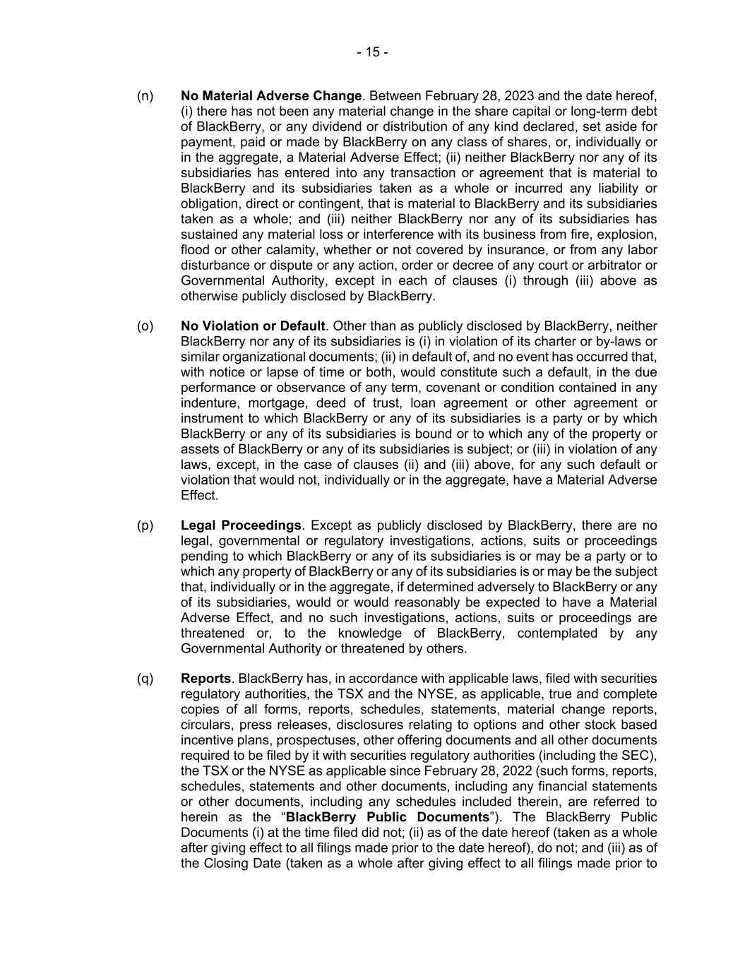 - 15 - (n) No Material Adverse Change. Between February 28, 2023 and the date hereof, (i) there has not been any material change in the share capital or long-term debt of BlackBerry, or any dividend or distribution of any kind declared, set aside for payment, paid or made by BlackBerry on any class of shares, or, individually or in the aggregate, a Material Adverse Effect; (ii) neither BlackBerry nor any of its subsidiaries has entered into any transaction or agreement that is material to BlackBerry and its subsidiaries taken as a whole or incurred any liability or obligation, direct or contingent, that is material to BlackBerry and its subsidiaries taken as a whole; and (iii) neither BlackBerry nor any of its subsidiaries has sustained any material loss or interference with its business from fire, explosion, flood or other calamity, whether or not covered by insurance, or from any labor disturbance or dispute or any action, order or decree of any court or arbitrator or Governmental Authority, except in each of clauses (i) through (iii) above as otherwise publicly disclosed by BlackBerry. (o) No Violation or Default. Other than as publicly disclosed by BlackBerry, neither BlackBerry nor any of its subsidiaries is (i) in violation of its charter or by-laws or similar organizational documents; (ii) in default of, and no event has occurred that, with notice or lapse of time or both, would constitute such a default, in the due performance or observance of any term, covenant or condition contained in any indenture, mortgage, deed of trust, loan agreement or other agreement or instrument to which BlackBerry or any of its subsidiaries is a party or by which BlackBerry or any of its subsidiaries is bound or to which any of the property or assets of BlackBerry or any of its subsidiaries is subject; or (iii) in violation of any laws, except, in the case of clauses (ii) and (iii) above, for any such default or violation that would not, individually or in the aggregate, have a Material Adverse Effect. (p) Legal Proceedings. Except as publicly disclosed by BlackBerry, there are no legal, governmental or regulatory investigations, actions, suits or proceedings pending to which BlackBerry or any of its subsidiaries is or may be a party or to which any property of BlackBerry or any of its subsidiaries is or may be the subject that, individually or in the aggregate, if determined adversely to BlackBerry or any of its subsidiaries, would or would reasonably be expected to have a Material Adverse Effect, and no such investigations, actions, suits or proceedings are threatened or, to the knowledge of BlackBerry, contemplated by any Governmental Authority or threatened by others. (q) Reports. BlackBerry has, in accordance with applicable laws, filed with securities regulatory authorities, the TSX and the NYSE, as applicable, true and complete copies of all forms, reports, schedules, statements, material change reports, circulars, press releases, disclosures relating to options and other stock based incentive plans, prospectuses, other offering documents and all other documents required to be filed by it with securities regulatory authorities (including the SEC), the TSX or the NYSE as applicable since February 28, 2022 (such forms, reports, schedules, statements and other documents, including any financial statements or other documents, including any schedules included therein, are referred to herein as the “BlackBerry Public Documents”). The BlackBerry Public Documents (i) at the time filed did not; (ii) as of the date hereof (taken as a whole after giving effect to all filings made prior to the date hereof), do not; and (iii) as of the Closing Date (taken as a whole after giving effect to all filings made prior to