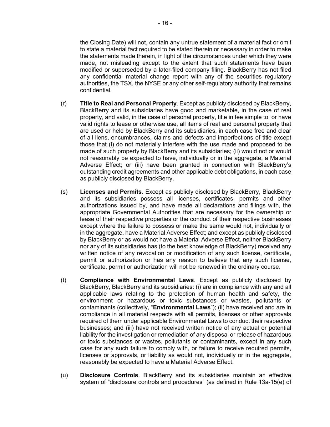 - 16 - the Closing Date) will not, contain any untrue statement of a material fact or omit to state a material fact required to be stated therein or necessary in order to make the statements made therein, in light of the circumstances under which they were made, not misleading except to the extent that such statements have been modified or superseded by a later-filed company filing. BlackBerry has not filed any confidential material change report with any of the securities regulatory authorities, the TSX, the NYSE or any other self-regulatory authority that remains confidential. (r) Title to Real and Personal Property. Except as publicly disclosed by BlackBerry, BlackBerry and its subsidiaries have good and marketable, in the case of real property, and valid, in the case of personal property, title in fee simple to, or have valid rights to lease or otherwise use, all items of real and personal property that are used or held by BlackBerry and its subsidiaries, in each case free and clear of all liens, encumbrances, claims and defects and imperfections of title except those that (i) do not materially interfere with the use made and proposed to be made of such property by BlackBerry and its subsidiaries; (ii) would not or would not reasonably be expected to have, individually or in the aggregate, a Material Adverse Effect; or (iii) have been granted in connection with BlackBerry’s outstanding credit agreements and other applicable debt obligations, in each case as publicly disclosed by BlackBerry. (s) Licenses and Permits. Except as publicly disclosed by BlackBerry, BlackBerry and its subsidiaries possess all licenses, certificates, permits and other authorizations issued by, and have made all declarations and filings with, the appropriate Governmental Authorities that are necessary for the ownership or lease of their respective properties or the conduct of their respective businesses except where the failure to possess or make the same would not, individually or in the aggregate, have a Material Adverse Effect; and except as publicly disclosed by BlackBerry or as would not have a Material Adverse Effect, neither BlackBerry nor any of its subsidiaries has (to the best knowledge of BlackBerry) received any written notice of any revocation or modification of any such license, certificate, permit or authorization or has any reason to believe that any such license, certificate, permit or authorization will not be renewed in the ordinary course. (t) Compliance with Environmental Laws. Except as publicly disclosed by BlackBerry, BlackBerry and its subsidiaries: (i) are in compliance with any and all applicable laws relating to the protection of human health and safety, the environment or hazardous or toxic substances or wastes, pollutants or contaminants (collectively, “Environmental Laws”); (ii) have received and are in compliance in all material respects with all permits, licenses or other approvals required of them under applicable Environmental Laws to conduct their respective businesses; and (iii) have not received written notice of any actual or potential liability for the investigation or remediation of any disposal or release of hazardous or toxic substances or wastes, pollutants or contaminants, except in any such case for any such failure to comply with, or failure to receive required permits, licenses or approvals, or liability as would not, individually or in the aggregate, reasonably be expected to have a Material Adverse Effect. (u) Disclosure Controls. BlackBerry and its subsidiaries maintain an effective system of “disclosure controls and procedures” (as defined in Rule 13a-15(e) of