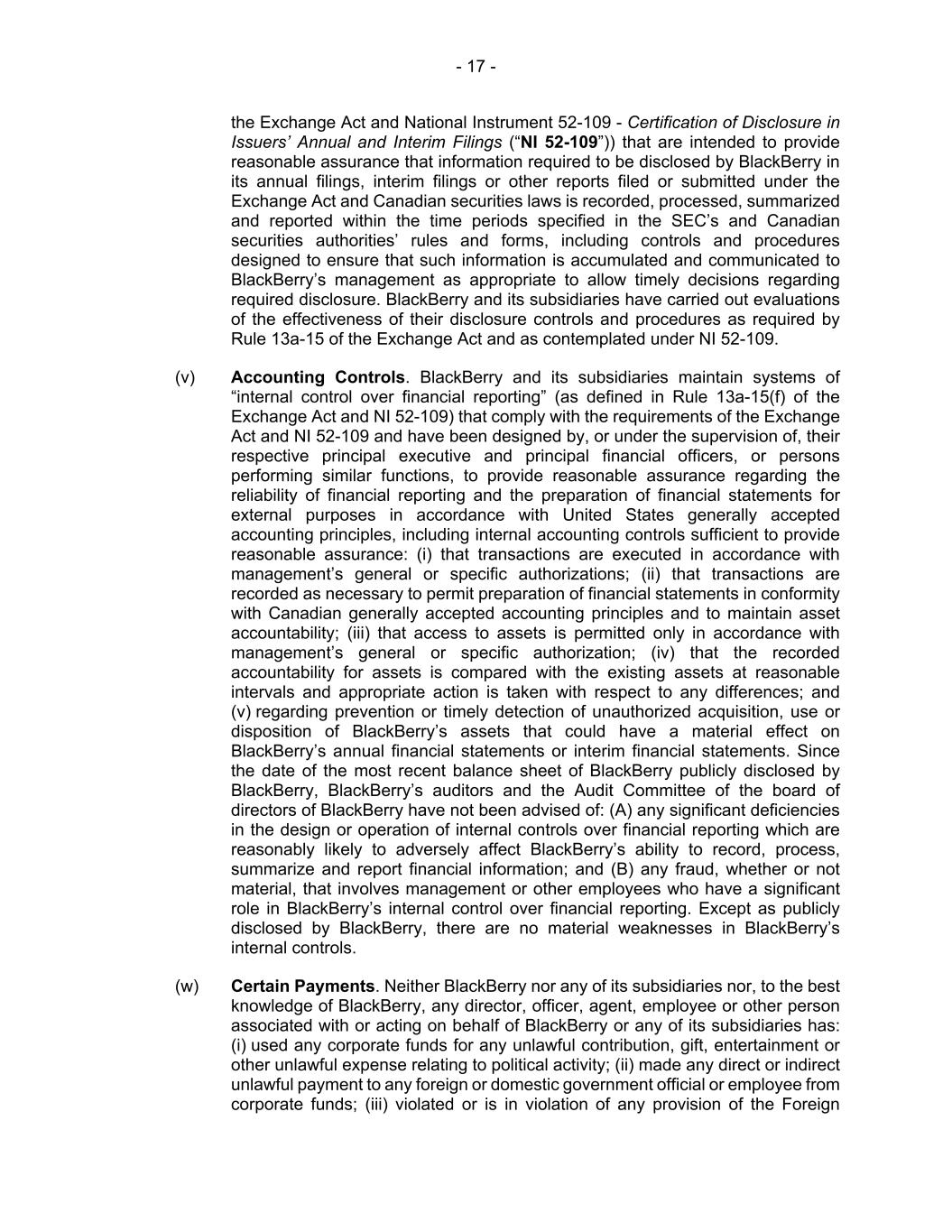 - 17 - the Exchange Act and National Instrument 52-109 - Certification of Disclosure in Issuers’ Annual and Interim Filings (“NI 52-109”)) that are intended to provide reasonable assurance that information required to be disclosed by BlackBerry in its annual filings, interim filings or other reports filed or submitted under the Exchange Act and Canadian securities laws is recorded, processed, summarized and reported within the time periods specified in the SEC’s and Canadian securities authorities’ rules and forms, including controls and procedures designed to ensure that such information is accumulated and communicated to BlackBerry’s management as appropriate to allow timely decisions regarding required disclosure. BlackBerry and its subsidiaries have carried out evaluations of the effectiveness of their disclosure controls and procedures as required by Rule 13a-15 of the Exchange Act and as contemplated under NI 52-109. (v) Accounting Controls. BlackBerry and its subsidiaries maintain systems of “internal control over financial reporting” (as defined in Rule 13a-15(f) of the Exchange Act and NI 52-109) that comply with the requirements of the Exchange Act and NI 52-109 and have been designed by, or under the supervision of, their respective principal executive and principal financial officers, or persons performing similar functions, to provide reasonable assurance regarding the reliability of financial reporting and the preparation of financial statements for external purposes in accordance with United States generally accepted accounting principles, including internal accounting controls sufficient to provide reasonable assurance: (i) that transactions are executed in accordance with management’s general or specific authorizations; (ii) that transactions are recorded as necessary to permit preparation of financial statements in conformity with Canadian generally accepted accounting principles and to maintain asset accountability; (iii) that access to assets is permitted only in accordance with management’s general or specific authorization; (iv) that the recorded accountability for assets is compared with the existing assets at reasonable intervals and appropriate action is taken with respect to any differences; and (v) regarding prevention or timely detection of unauthorized acquisition, use or disposition of BlackBerry’s assets that could have a material effect on BlackBerry’s annual financial statements or interim financial statements. Since the date of the most recent balance sheet of BlackBerry publicly disclosed by BlackBerry, BlackBerry’s auditors and the Audit Committee of the board of directors of BlackBerry have not been advised of: (A) any significant deficiencies in the design or operation of internal controls over financial reporting which are reasonably likely to adversely affect BlackBerry’s ability to record, process, summarize and report financial information; and (B) any fraud, whether or not material, that involves management or other employees who have a significant role in BlackBerry’s internal control over financial reporting. Except as publicly disclosed by BlackBerry, there are no material weaknesses in BlackBerry’s internal controls. (w) Certain Payments. Neither BlackBerry nor any of its subsidiaries nor, to the best knowledge of BlackBerry, any director, officer, agent, employee or other person associated with or acting on behalf of BlackBerry or any of its subsidiaries has: (i) used any corporate funds for any unlawful contribution, gift, entertainment or other unlawful expense relating to political activity; (ii) made any direct or indirect unlawful payment to any foreign or domestic government official or employee from corporate funds; (iii) violated or is in violation of any provision of the Foreign
