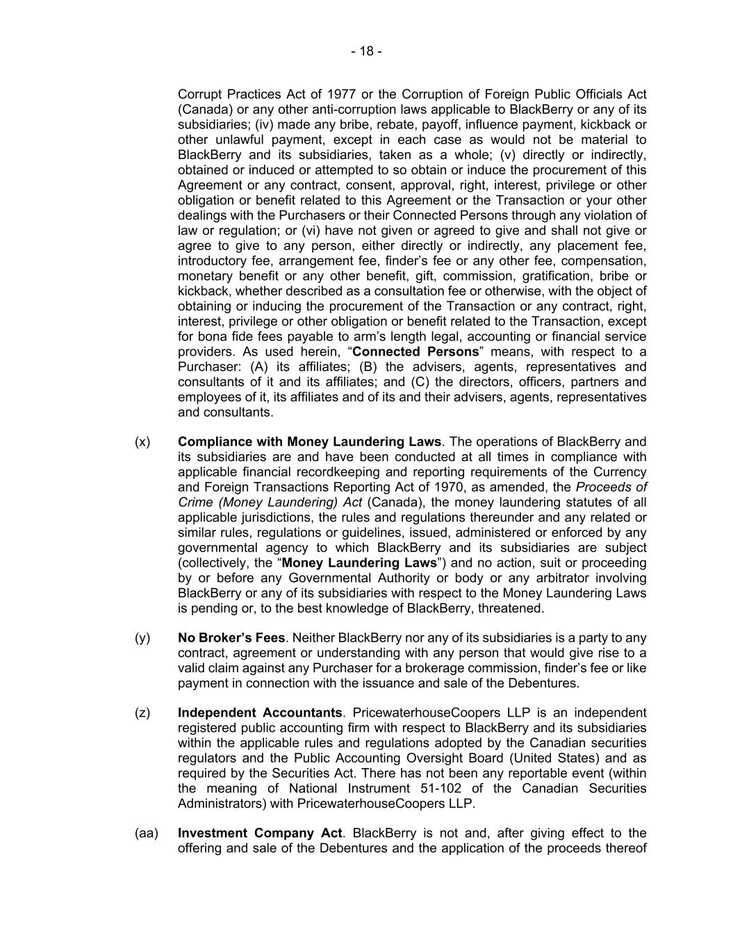 - 18 - Corrupt Practices Act of 1977 or the Corruption of Foreign Public Officials Act (Canada) or any other anti-corruption laws applicable to BlackBerry or any of its subsidiaries; (iv) made any bribe, rebate, payoff, influence payment, kickback or other unlawful payment, except in each case as would not be material to BlackBerry and its subsidiaries, taken as a whole; (v) directly or indirectly, obtained or induced or attempted to so obtain or induce the procurement of this Agreement or any contract, consent, approval, right, interest, privilege or other obligation or benefit related to this Agreement or the Transaction or your other dealings with the Purchasers or their Connected Persons through any violation of law or regulation; or (vi) have not given or agreed to give and shall not give or agree to give to any person, either directly or indirectly, any placement fee, introductory fee, arrangement fee, finder’s fee or any other fee, compensation, monetary benefit or any other benefit, gift, commission, gratification, bribe or kickback, whether described as a consultation fee or otherwise, with the object of obtaining or inducing the procurement of the Transaction or any contract, right, interest, privilege or other obligation or benefit related to the Transaction, except for bona fide fees payable to arm’s length legal, accounting or financial service providers. As used herein, “Connected Persons” means, with respect to a Purchaser: (A) its affiliates; (B) the advisers, agents, representatives and consultants of it and its affiliates; and (C) the directors, officers, partners and employees of it, its affiliates and of its and their advisers, agents, representatives and consultants. (x) Compliance with Money Laundering Laws. The operations of BlackBerry and its subsidiaries are and have been conducted at all times in compliance with applicable financial recordkeeping and reporting requirements of the Currency and Foreign Transactions Reporting Act of 1970, as amended, the Proceeds of Crime (Money Laundering) Act (Canada), the money laundering statutes of all applicable jurisdictions, the rules and regulations thereunder and any related or similar rules, regulations or guidelines, issued, administered or enforced by any governmental agency to which BlackBerry and its subsidiaries are subject (collectively, the “Money Laundering Laws”) and no action, suit or proceeding by or before any Governmental Authority or body or any arbitrator involving BlackBerry or any of its subsidiaries with respect to the Money Laundering Laws is pending or, to the best knowledge of BlackBerry, threatened. (y) No Broker’s Fees. Neither BlackBerry nor any of its subsidiaries is a party to any contract, agreement or understanding with any person that would give rise to a valid claim against any Purchaser for a brokerage commission, finder’s fee or like payment in connection with the issuance and sale of the Debentures. (z) Independent Accountants. PricewaterhouseCoopers LLP is an independent registered public accounting firm with respect to BlackBerry and its subsidiaries within the applicable rules and regulations adopted by the Canadian securities regulators and the Public Accounting Oversight Board (United States) and as required by the Securities Act. There has not been any reportable event (within the meaning of National Instrument 51-102 of the Canadian Securities Administrators) with PricewaterhouseCoopers LLP. (aa) Investment Company Act. BlackBerry is not and, after giving effect to the offering and sale of the Debentures and the application of the proceeds thereof