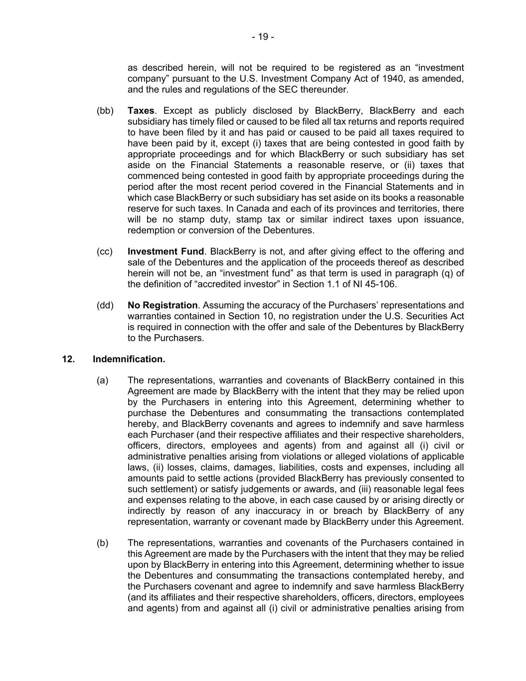 - 19 - as described herein, will not be required to be registered as an “investment company” pursuant to the U.S. Investment Company Act of 1940, as amended, and the rules and regulations of the SEC thereunder. (bb) Taxes. Except as publicly disclosed by BlackBerry, BlackBerry and each subsidiary has timely filed or caused to be filed all tax returns and reports required to have been filed by it and has paid or caused to be paid all taxes required to have been paid by it, except (i) taxes that are being contested in good faith by appropriate proceedings and for which BlackBerry or such subsidiary has set aside on the Financial Statements a reasonable reserve, or (ii) taxes that commenced being contested in good faith by appropriate proceedings during the period after the most recent period covered in the Financial Statements and in which case BlackBerry or such subsidiary has set aside on its books a reasonable reserve for such taxes. In Canada and each of its provinces and territories, there will be no stamp duty, stamp tax or similar indirect taxes upon issuance, redemption or conversion of the Debentures. (cc) Investment Fund. BlackBerry is not, and after giving effect to the offering and sale of the Debentures and the application of the proceeds thereof as described herein will not be, an “investment fund” as that term is used in paragraph (q) of the definition of “accredited investor” in Section 1.1 of NI 45-106. (dd) No Registration. Assuming the accuracy of the Purchasers’ representations and warranties contained in Section 10, no registration under the U.S. Securities Act is required in connection with the offer and sale of the Debentures by BlackBerry to the Purchasers. 12. Indemnification. (a) The representations, warranties and covenants of BlackBerry contained in this Agreement are made by BlackBerry with the intent that they may be relied upon by the Purchasers in entering into this Agreement, determining whether to purchase the Debentures and consummating the transactions contemplated hereby, and BlackBerry covenants and agrees to indemnify and save harmless each Purchaser (and their respective affiliates and their respective shareholders, officers, directors, employees and agents) from and against all (i) civil or administrative penalties arising from violations or alleged violations of applicable laws, (ii) losses, claims, damages, liabilities, costs and expenses, including all amounts paid to settle actions (provided BlackBerry has previously consented to such settlement) or satisfy judgements or awards, and (iii) reasonable legal fees and expenses relating to the above, in each case caused by or arising directly or indirectly by reason of any inaccuracy in or breach by BlackBerry of any representation, warranty or covenant made by BlackBerry under this Agreement. (b) The representations, warranties and covenants of the Purchasers contained in this Agreement are made by the Purchasers with the intent that they may be relied upon by BlackBerry in entering into this Agreement, determining whether to issue the Debentures and consummating the transactions contemplated hereby, and the Purchasers covenant and agree to indemnify and save harmless BlackBerry (and its affiliates and their respective shareholders, officers, directors, employees and agents) from and against all (i) civil or administrative penalties arising from