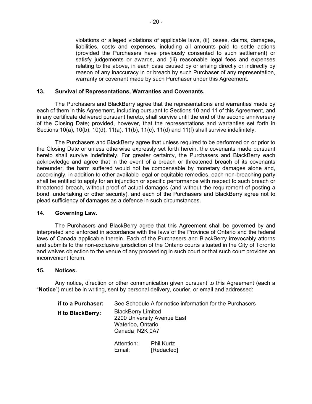 - 20 - violations or alleged violations of applicable laws, (ii) losses, claims, damages, liabilities, costs and expenses, including all amounts paid to settle actions (provided the Purchasers have previously consented to such settlement) or satisfy judgements or awards, and (iii) reasonable legal fees and expenses relating to the above, in each case caused by or arising directly or indirectly by reason of any inaccuracy in or breach by such Purchaser of any representation, warranty or covenant made by such Purchaser under this Agreement. 13. Survival of Representations, Warranties and Covenants. The Purchasers and BlackBerry agree that the representations and warranties made by each of them in this Agreement, including pursuant to Sections 10 and 11 of this Agreement, and in any certificate delivered pursuant hereto, shall survive until the end of the second anniversary of the Closing Date; provided, however, that the representations and warranties set forth in Sections 10(a), 10(b), 10(d), 11(a), 11(b), 11(c), 11(d) and 11(f) shall survive indefinitely. The Purchasers and BlackBerry agree that unless required to be performed on or prior to the Closing Date or unless otherwise expressly set forth herein, the covenants made pursuant hereto shall survive indefinitely. For greater certainty, the Purchasers and BlackBerry each acknowledge and agree that in the event of a breach or threatened breach of its covenants hereunder, the harm suffered would not be compensable by monetary damages alone and, accordingly, in addition to other available legal or equitable remedies, each non-breaching party shall be entitled to apply for an injunction or specific performance with respect to such breach or threatened breach, without proof of actual damages (and without the requirement of posting a bond, undertaking or other security), and each of the Purchasers and BlackBerry agree not to plead sufficiency of damages as a defence in such circumstances. 14. Governing Law. The Purchasers and BlackBerry agree that this Agreement shall be governed by and interpreted and enforced in accordance with the laws of the Province of Ontario and the federal laws of Canada applicable therein. Each of the Purchasers and BlackBerry irrevocably attorns and submits to the non-exclusive jurisdiction of the Ontario courts situated in the City of Toronto and waives objection to the venue of any proceeding in such court or that such court provides an inconvenient forum. 15. Notices. Any notice, direction or other communication given pursuant to this Agreement (each a “Notice”) must be in writing, sent by personal delivery, courier, or email and addressed: if to a Purchaser: See Schedule A for notice information for the Purchasers if to BlackBerry: BlackBerry Limited 2200 University Avenue East Waterloo, Ontario Canada N2K 0A7 Attention: Phil Kurtz Email: [Redacted]