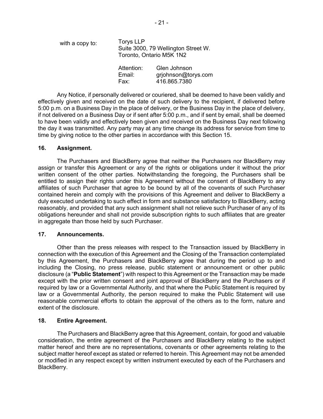 - 21 - with a copy to: Torys LLP Suite 3000, 79 Wellington Street W. Toronto, Ontario M5K 1N2 Attention: Glen Johnson Email: grjohnson@torys.com Fax: 416.865.7380 Any Notice, if personally delivered or couriered, shall be deemed to have been validly and effectively given and received on the date of such delivery to the recipient, if delivered before 5:00 p.m. on a Business Day in the place of delivery, or the Business Day in the place of delivery, if not delivered on a Business Day or if sent after 5:00 p.m., and if sent by email, shall be deemed to have been validly and effectively been given and received on the Business Day next following the day it was transmitted. Any party may at any time change its address for service from time to time by giving notice to the other parties in accordance with this Section 15. 16. Assignment. The Purchasers and BlackBerry agree that neither the Purchasers nor BlackBerry may assign or transfer this Agreement or any of the rights or obligations under it without the prior written consent of the other parties. Notwithstanding the foregoing, the Purchasers shall be entitled to assign their rights under this Agreement without the consent of BlackBerry to any affiliates of such Purchaser that agree to be bound by all of the covenants of such Purchaser contained herein and comply with the provisions of this Agreement and deliver to BlackBerry a duly executed undertaking to such effect in form and substance satisfactory to BlackBerry, acting reasonably, and provided that any such assignment shall not relieve such Purchaser of any of its obligations hereunder and shall not provide subscription rights to such affiliates that are greater in aggregate than those held by such Purchaser. 17. Announcements. Other than the press releases with respect to the Transaction issued by BlackBerry in connection with the execution of this Agreement and the Closing of the Transaction contemplated by this Agreement, the Purchasers and BlackBerry agree that during the period up to and including the Closing, no press release, public statement or announcement or other public disclosure (a “Public Statement”) with respect to this Agreement or the Transaction may be made except with the prior written consent and joint approval of BlackBerry and the Purchasers or if required by law or a Governmental Authority, and that where the Public Statement is required by law or a Governmental Authority, the person required to make the Public Statement will use reasonable commercial efforts to obtain the approval of the others as to the form, nature and extent of the disclosure. 18. Entire Agreement. The Purchasers and BlackBerry agree that this Agreement, contain, for good and valuable consideration, the entire agreement of the Purchasers and BlackBerry relating to the subject matter hereof and there are no representations, covenants or other agreements relating to the subject matter hereof except as stated or referred to herein. This Agreement may not be amended or modified in any respect except by written instrument executed by each of the Purchasers and BlackBerry.