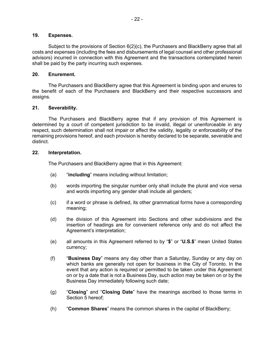 - 22 - 19. Expenses. Subject to the provisions of Section 6(2)(c), the Purchasers and BlackBerry agree that all costs and expenses (including the fees and disbursements of legal counsel and other professional advisors) incurred in connection with this Agreement and the transactions contemplated herein shall be paid by the party incurring such expenses. 20. Enurement. The Purchasers and BlackBerry agree that this Agreement is binding upon and enures to the benefit of each of the Purchasers and BlackBerry and their respective successors and assigns. 21. Severability. The Purchasers and BlackBerry agree that if any provision of this Agreement is determined by a court of competent jurisdiction to be invalid, illegal or unenforceable in any respect, such determination shall not impair or affect the validity, legality or enforceability of the remaining provisions hereof, and each provision is hereby declared to be separate, severable and distinct. 22. Interpretation. The Purchasers and BlackBerry agree that in this Agreement: (a) “including” means including without limitation; (b) words importing the singular number only shall include the plural and vice versa and words importing any gender shall include all genders; (c) if a word or phrase is defined, its other grammatical forms have a corresponding meaning; (d) the division of this Agreement into Sections and other subdivisions and the insertion of headings are for convenient reference only and do not affect the Agreement’s interpretation; (e) all amounts in this Agreement referred to by “$” or “U.S.$” mean United States currency; (f) “Business Day” means any day other than a Saturday, Sunday or any day on which banks are generally not open for business in the City of Toronto. In the event that any action is required or permitted to be taken under this Agreement on or by a date that is not a Business Day, such action may be taken on or by the Business Day immediately following such date; (g) “Closing” and “Closing Date” have the meanings ascribed to those terms in Section 5 hereof; (h) “Common Shares” means the common shares in the capital of BlackBerry;